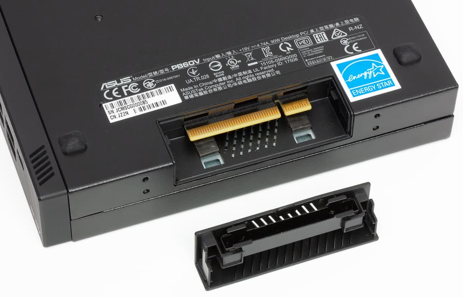 Еще один разъем, расположенный на грани между нижней и боковой панелями корпуса, закрыт заглушкой. Дело в том, что мини-ПК Asus PB60V имеет модульную конструкцию и может стекироваться с дополнительным модулем на базе профессиональной видеокарты Nvidia Quadro P620/P1000.