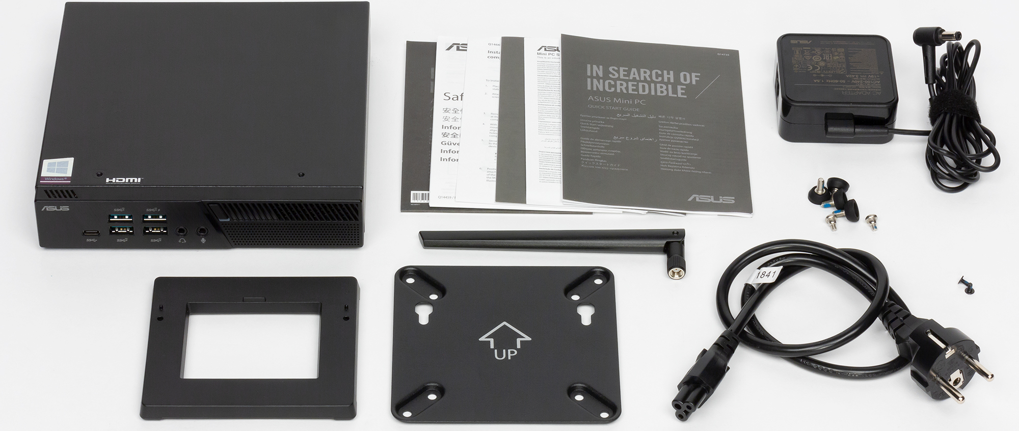 В комплект поставки, кроме самого мини-ПК, входит адаптер питания на 65 Вт (19 В; 3,42 A), краткое руководство пользователя, гарантийный талон, а также антенна, подставка для вертикального расположения корпуса мини-ПК и VESA-рамка для крепления корпуса к монитору.