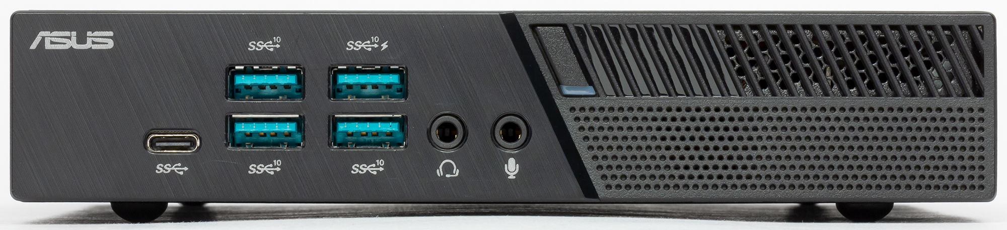 На передней панели корпуса расположены 4 порта USB 3.1, 1 порт USB 3.0 (Type-C) и 2 аудиоразъема типа миниджек для наушников и микрофона. Тут же расположена и кнопка включения, дополненная светодиодным индикатором.