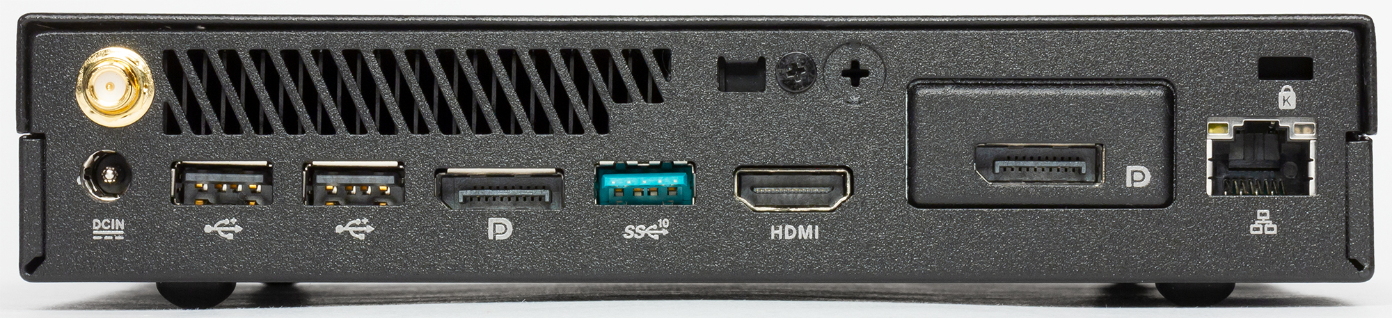 На задней панели корпуса расположены: разъем питания, 2 порта USB 2.0, 1 порт USB 3.1, разъем RJ-45 и видеовыходы DisplayPort и HDMI.