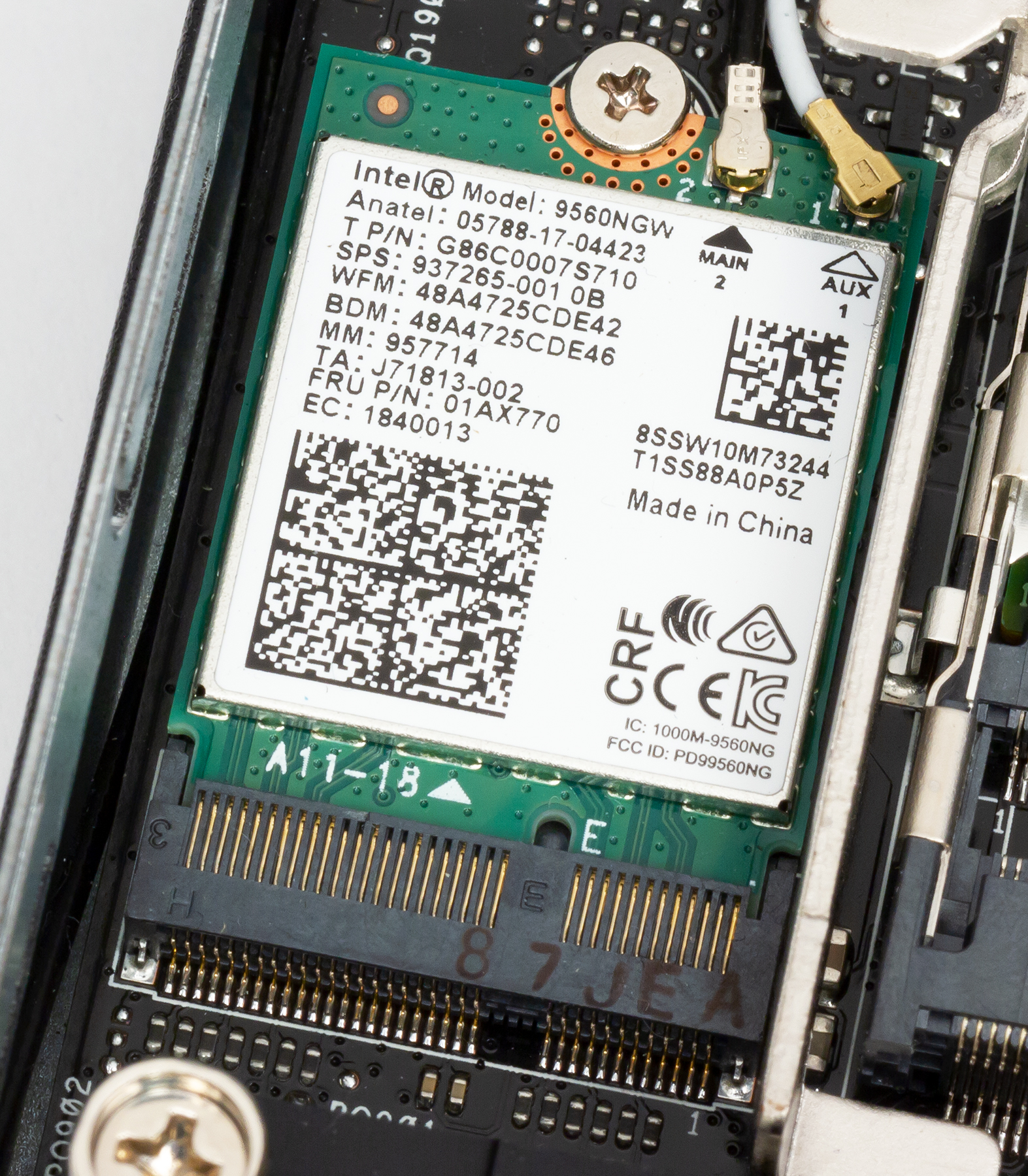 Коммуникационные возможности мини-ПК определяются наличием сетевого гигабитного адаптера Intel i219-LM и беспроводного Wi-Fi-адаптера Intel Wireless-AC 9560 (CNVi), который к тому же реализует поддержку Bluetooth 5.0.