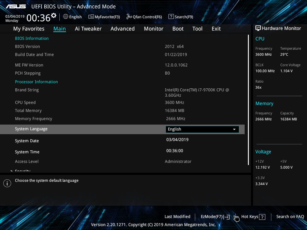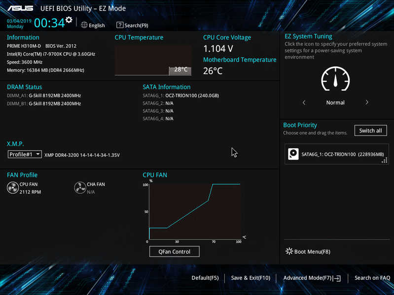 Попадаем в общее «простое» меню, где по сути одна информация (выбор режима EZ System Tuning бесполезен из-за блокировки разгонов), так что нажимаем F7 и попадаем уже в «продвинутое» меню.