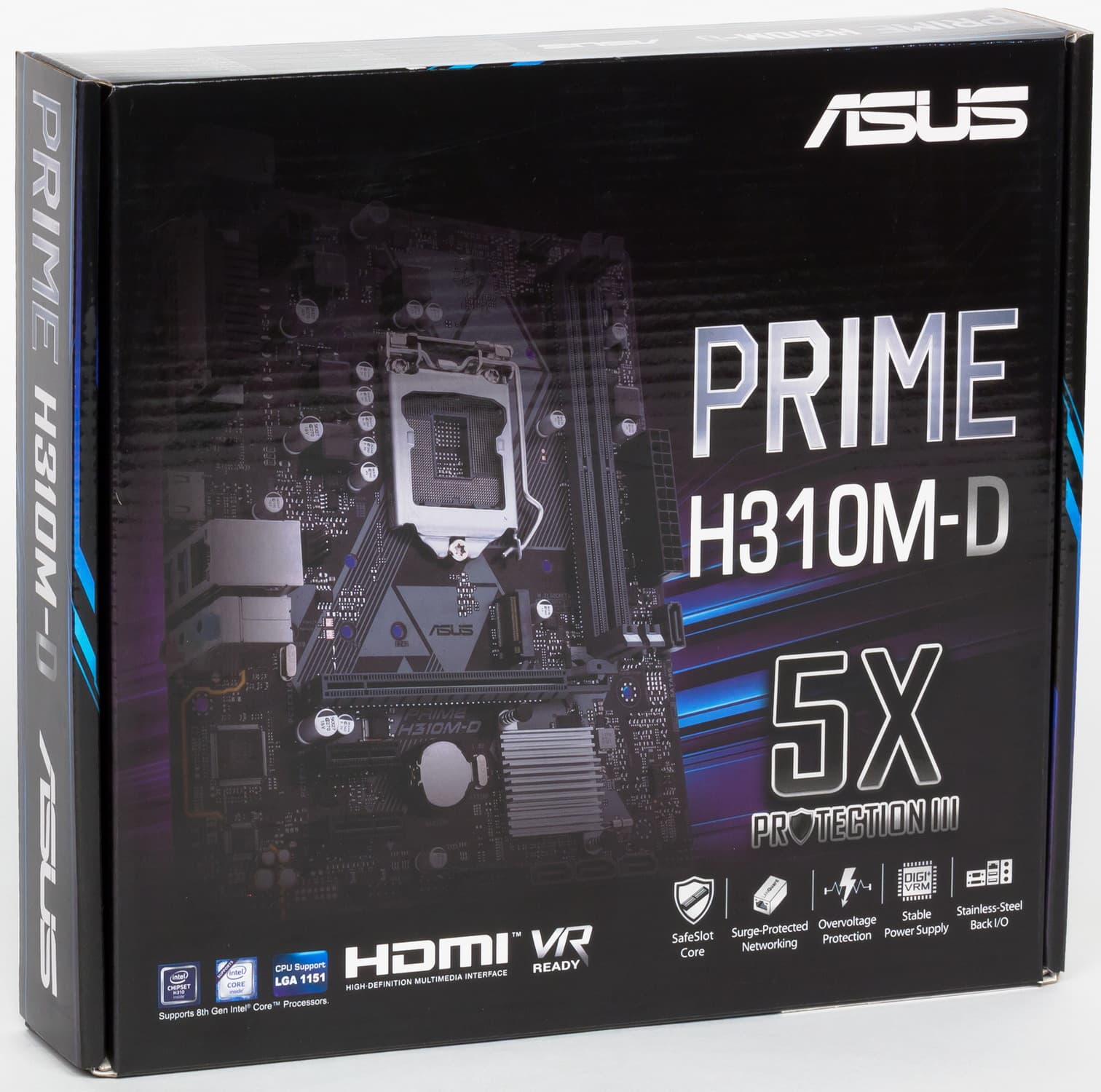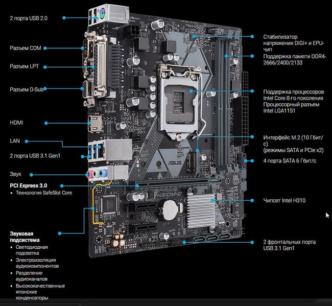 Еще раз надо напомнить, что Asus Prime H310M-D поддерживает процессоры Intel Core 8-го и 9-го поколений, выполненные под разъем (сокет) LGA1151v2. Хотя физически отличий от старого LGA1151 нет, старые процессоры в LGA1151 v2 работать не будут. Поэтому еще раз напомню: только модели с индексами 8000 и 9000!