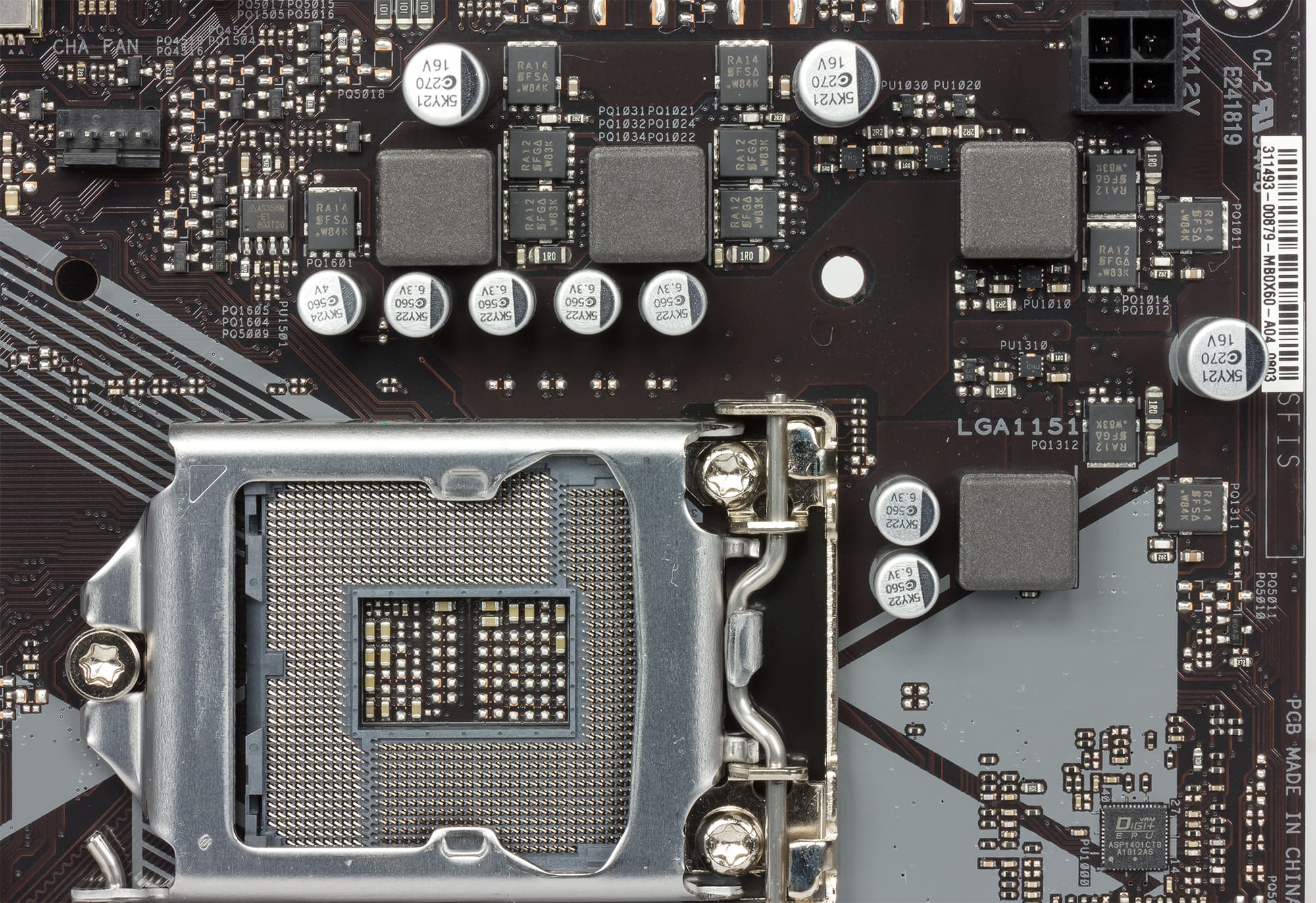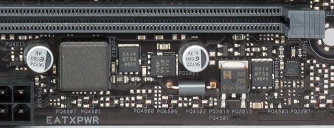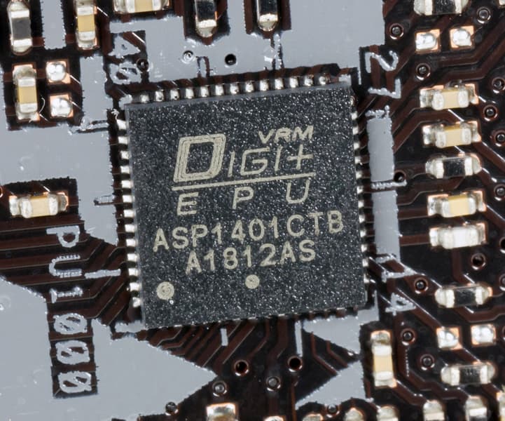 Каждый канал фазы имеет ферритовый дроссель и три транзистора от Texas Instruments. Управлением фазами занимается цифровой контроллер Digi+ EPU ASP1401.