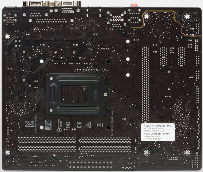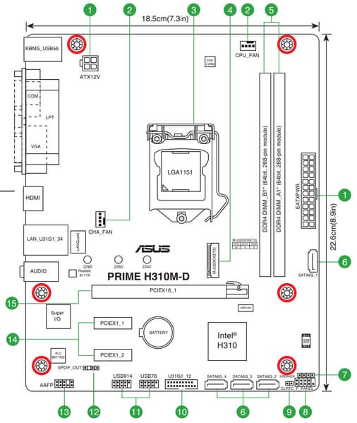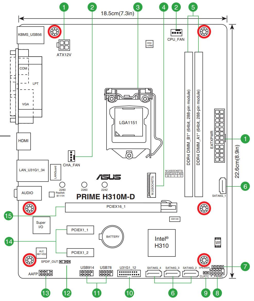 Форм-фактор microATX имеет размеры до 244×244 мм. Материнская плата Asus Prime H310M-D имеет размеры 226×185 мм, поэтому она больше подходит для форм-фактора FlexATX (однако этот термин не прижился, его считают одной из вариаций microATX). На плате имеются 6 монтажных отверстий для установки в корпус..