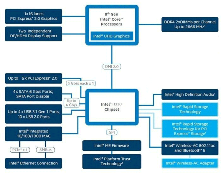 Процессоры Intel Core 8-го и 9-го поколений (совместимые с сокетом LGA1152v2 и поддерживаемые H310) имеют 16 линий ввода-вывода (включая PCI-E 3.0/2.0), не имеют USB и SATA портов. При этом взаимодействие с H310 идет по особому каналу Digital Media Interface 2.0 (DMI 2.0), и линии PCI-E на это не расходуются. Все PCI-E линии процессора идут на слоты расширения PCI-E.