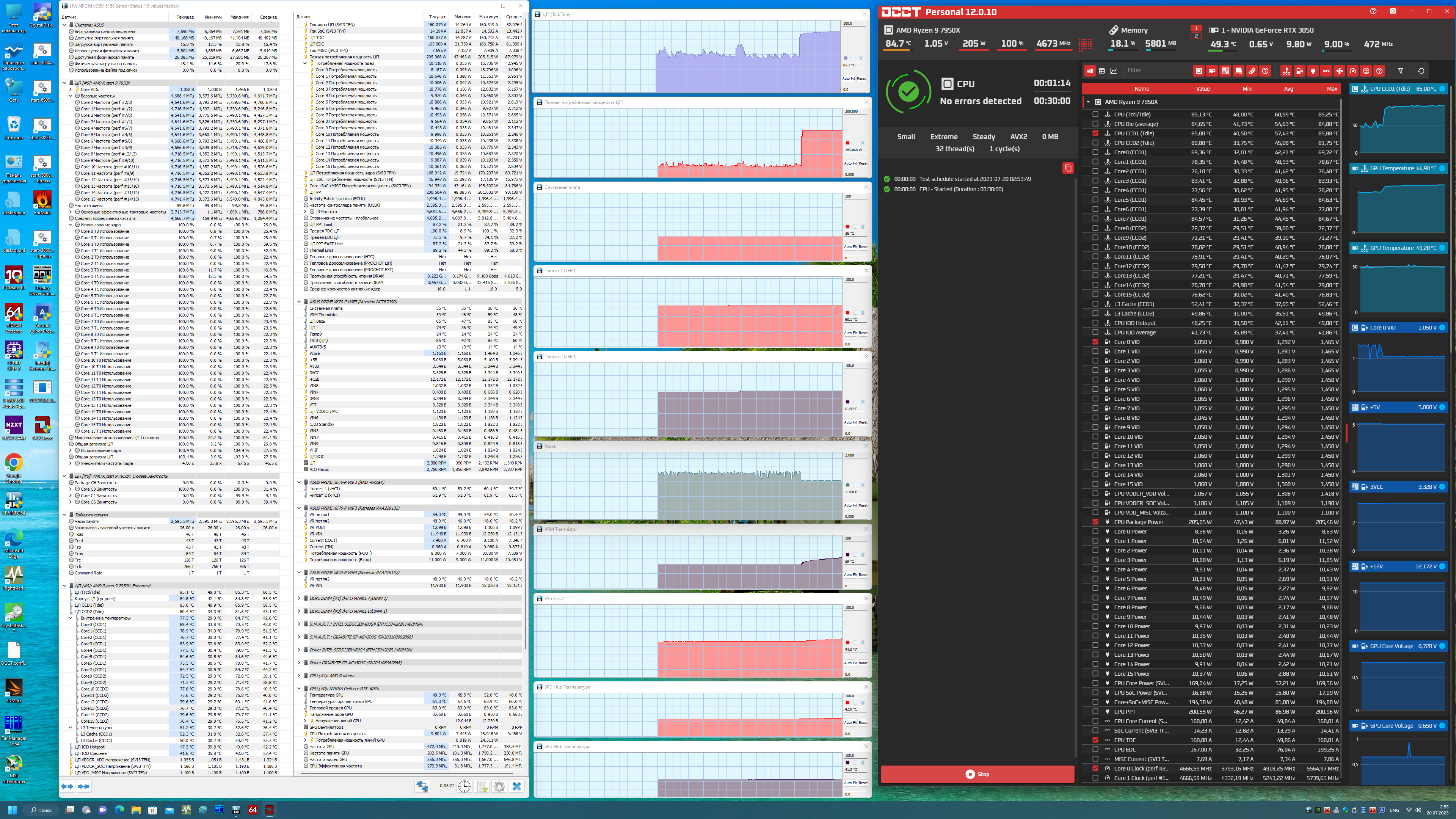 Все это нам говорит о том, что топовые процессоры AMD при чрезмерной и практически никогда не бывающей в реальной жизни нагрузке вынуждены нагреваться до крайне высоких температур даже при очень мощных системах охлаждения, однако при этом срабатывает уже защита, и частоты работы падают. Вернее снижается автоматический оверклокинг, заданный самой системой, когда как базовые частоты у того же Ryzen 9 7950X – 4,5 ГГц.
