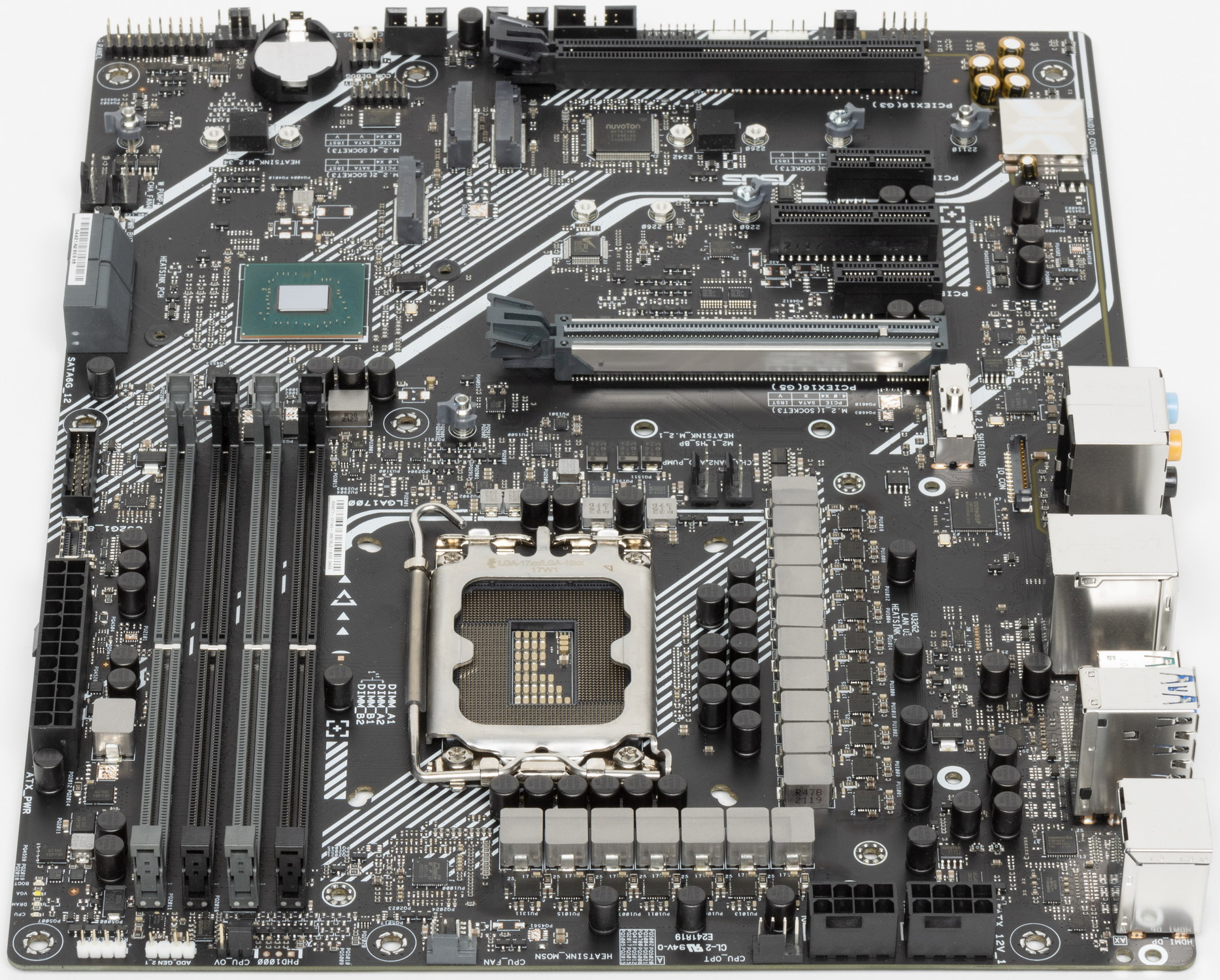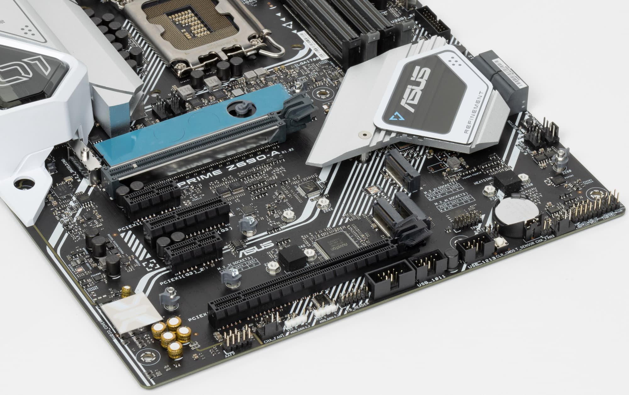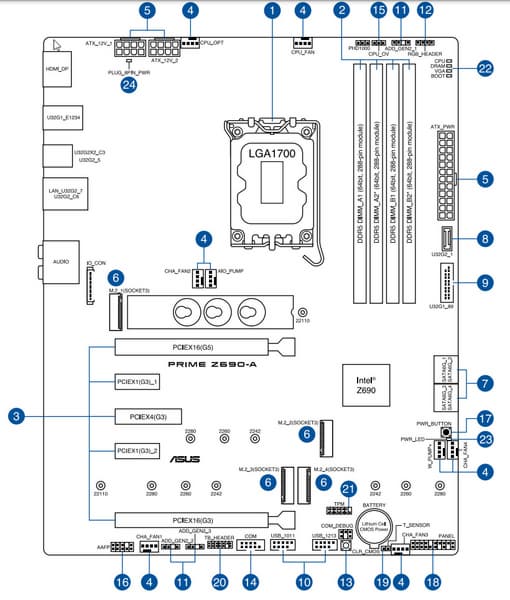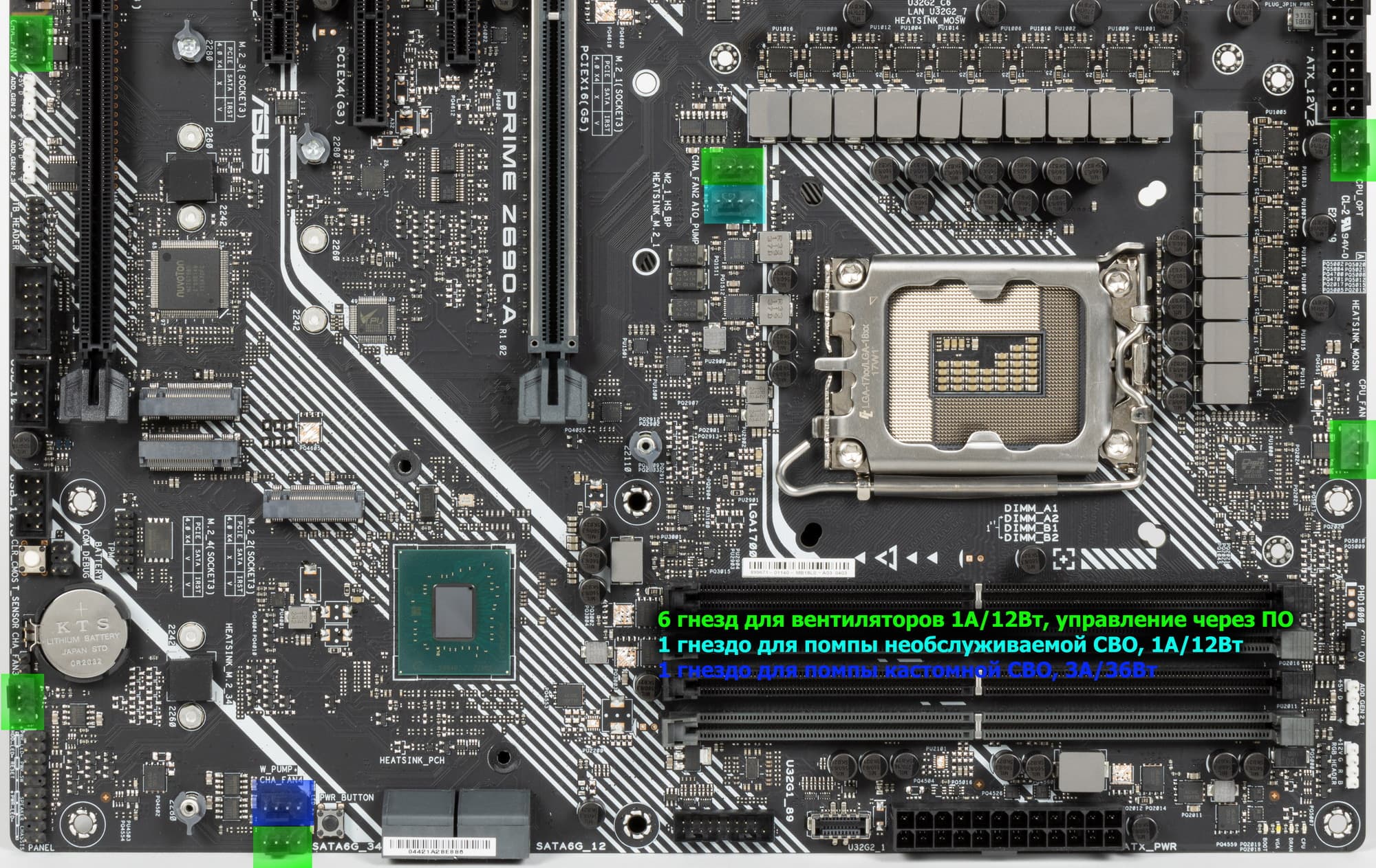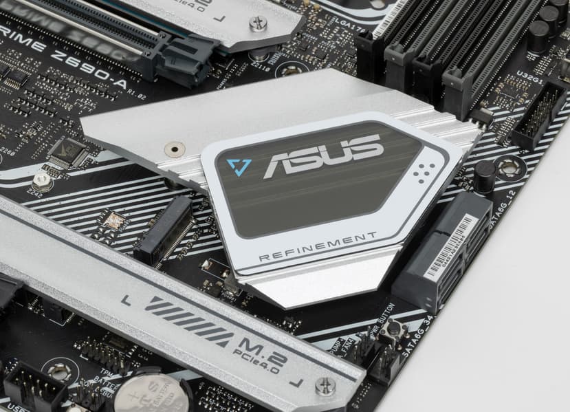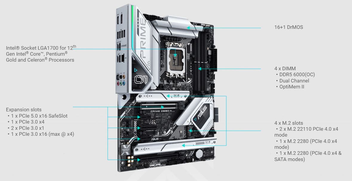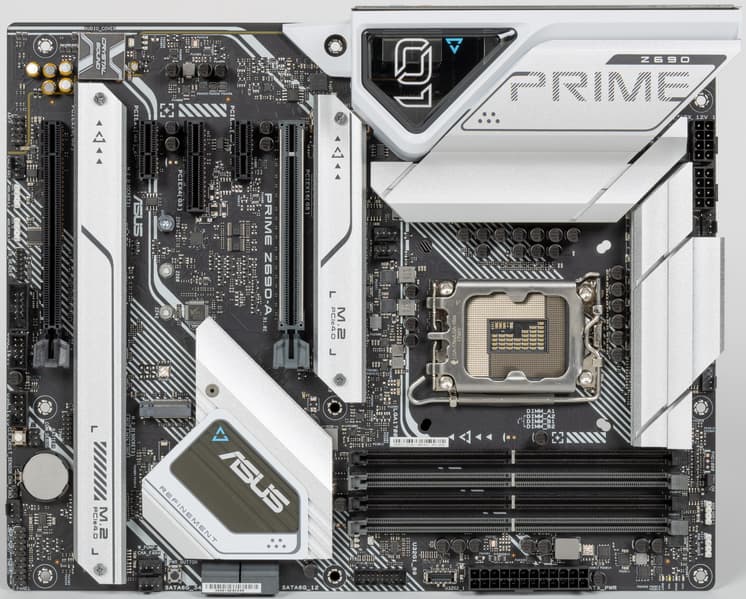 Еще раз надо напомнить, что Asus Prime Z690-A поддерживает процессоры Intel Core 12-го поколения, выполненные под разъем (сокет) LGA1700. Система крепления систем охлаждения для CPU несовместима с той, что для LGA1151/1200. Для совместимости со старыми СО у данной платы имеются овальные отверстия вокруг сокета. Однако следует иметь в виду, что при использовании старых СО придется где-то приобретать или заказывать у производителя комплект крепежа под LGA 1700. Дело в в том, что новые процессоры 12ххх на 0.8 мм тоньше предшественников, и кулеры с жесткой установкой в матплате на фиксированную высоту просто не достанут до 12ххх. Подойдут лишь СО с пружинистой посадкой подошвы на процессор.