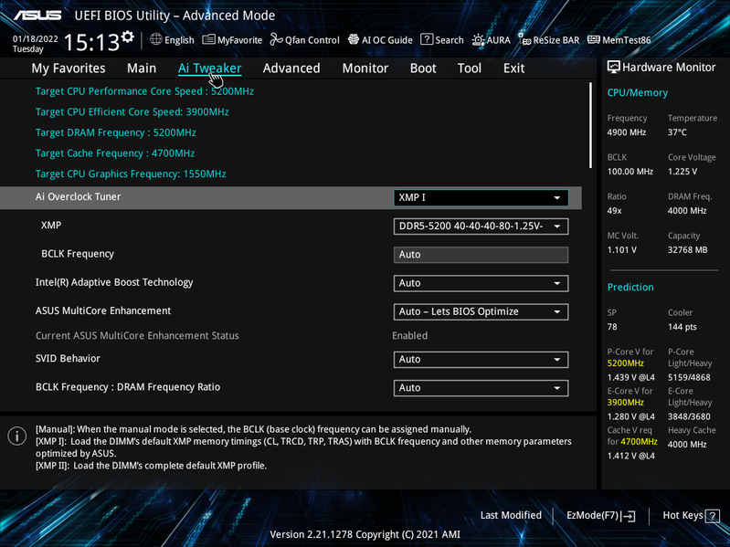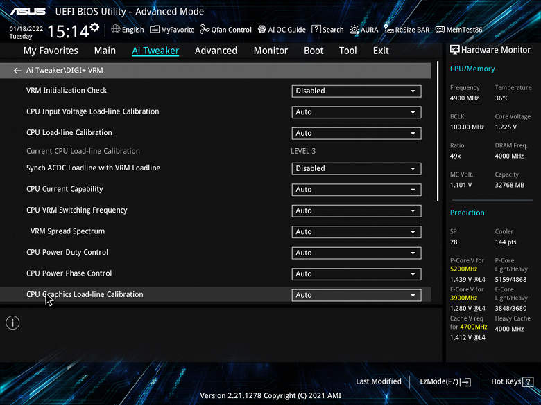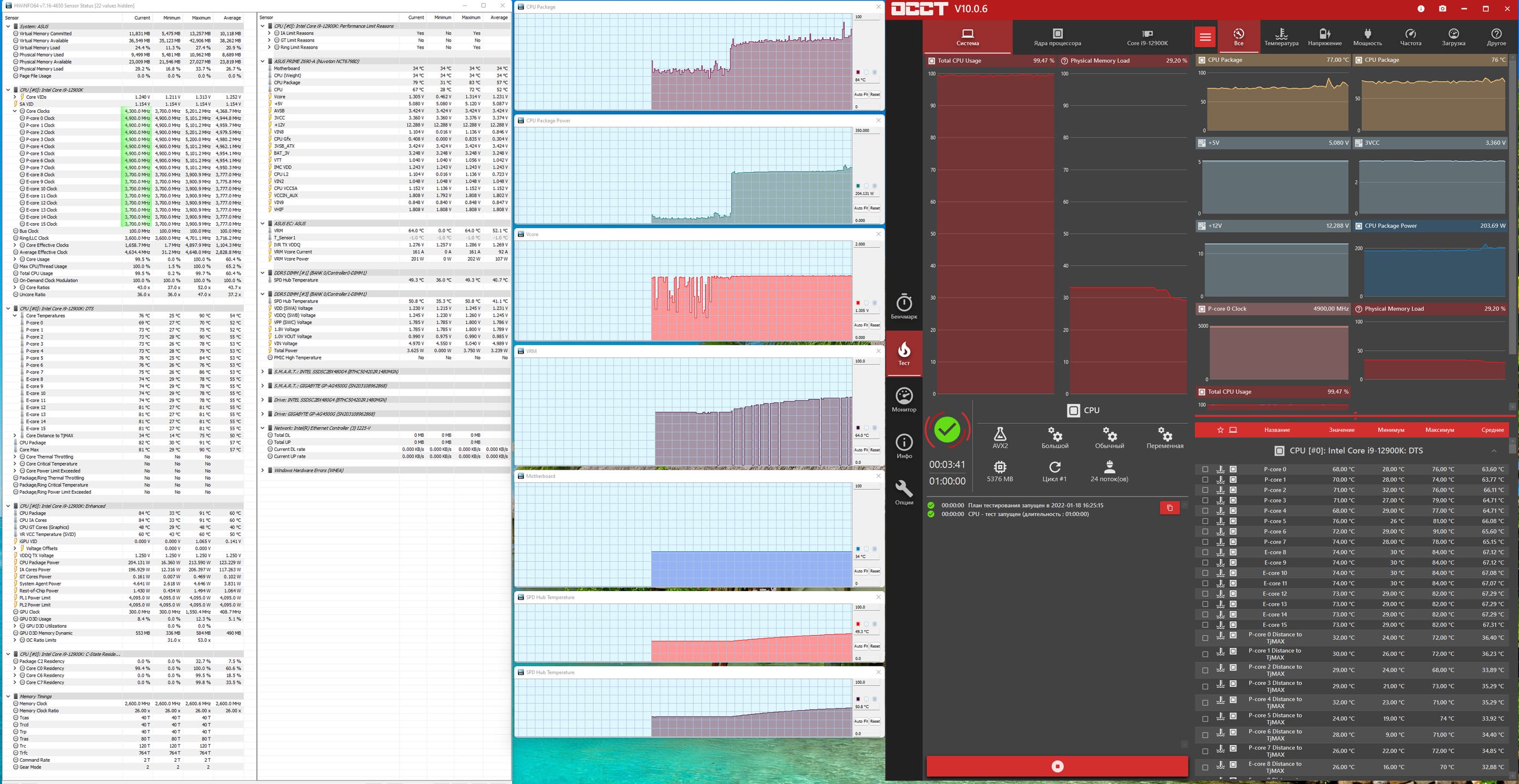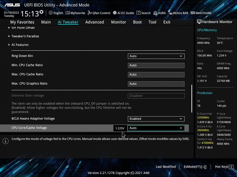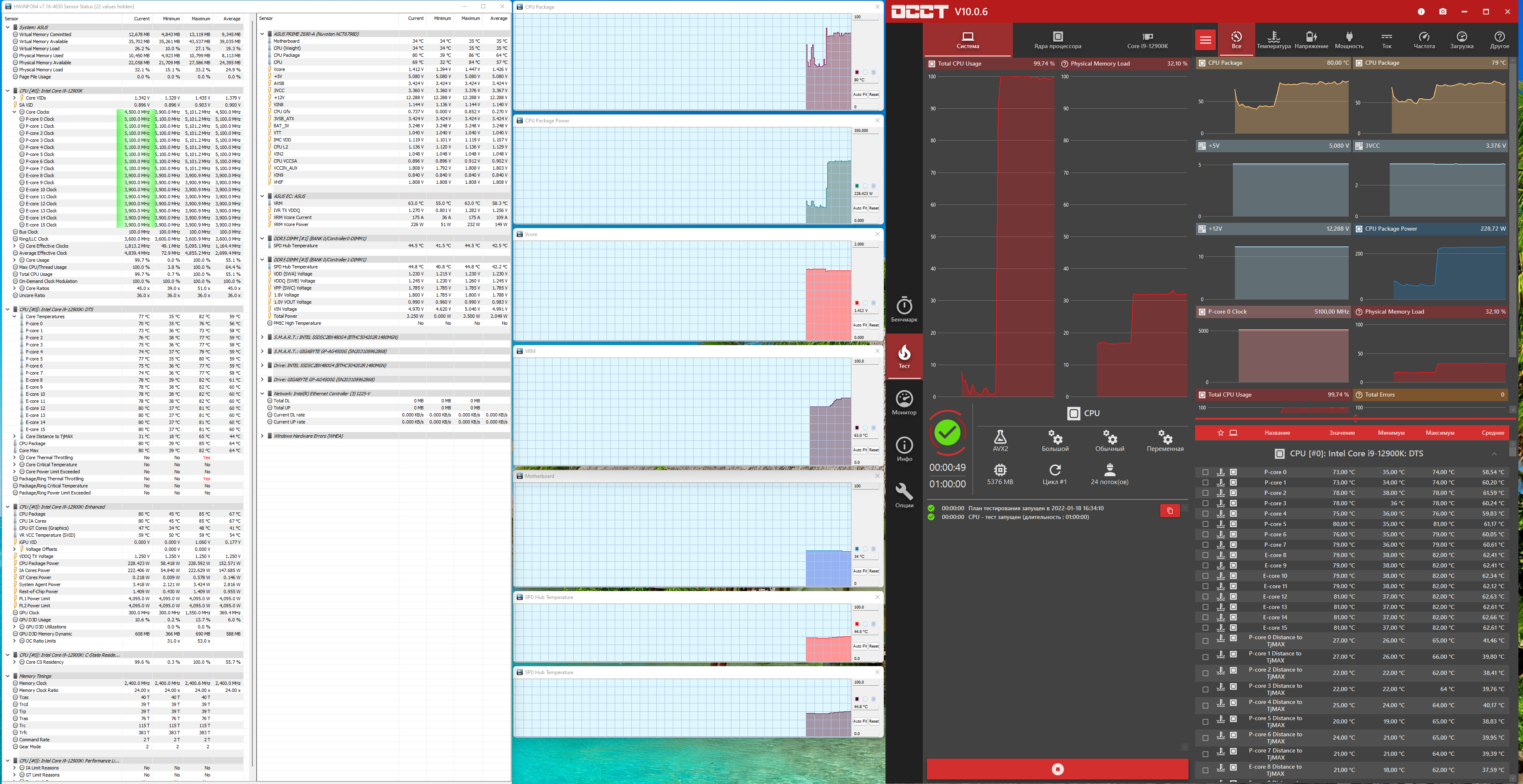 Я просто выставил нужные параметры в BIOS (автоматическая «умная» оптимизация AI от Asus через ту же программу AI-Suite в данном случае мало чего дала, ограничившись 4,9 — 5,0 ГГц по Р-ядрам). И что мы видим? — Да просто великолепная поддержка супероверклокинга! Процессор в стресс-тесте работал на 5,1/3,9 ГГц, потребляя более 230 Вт, фирменная СВО прекрасно справлялась с нагревом, критических отметок не было, VRM, чипсет также не нагревались до критических величин.