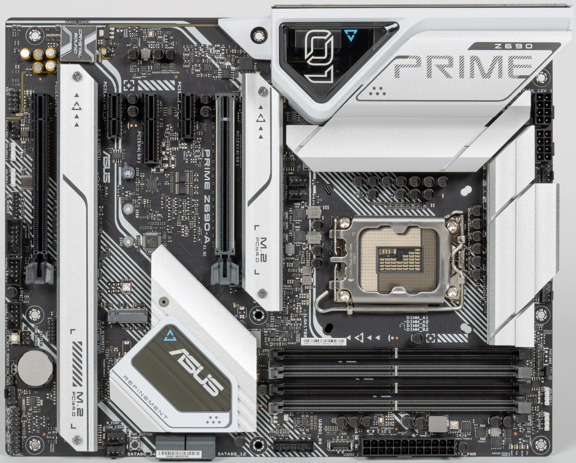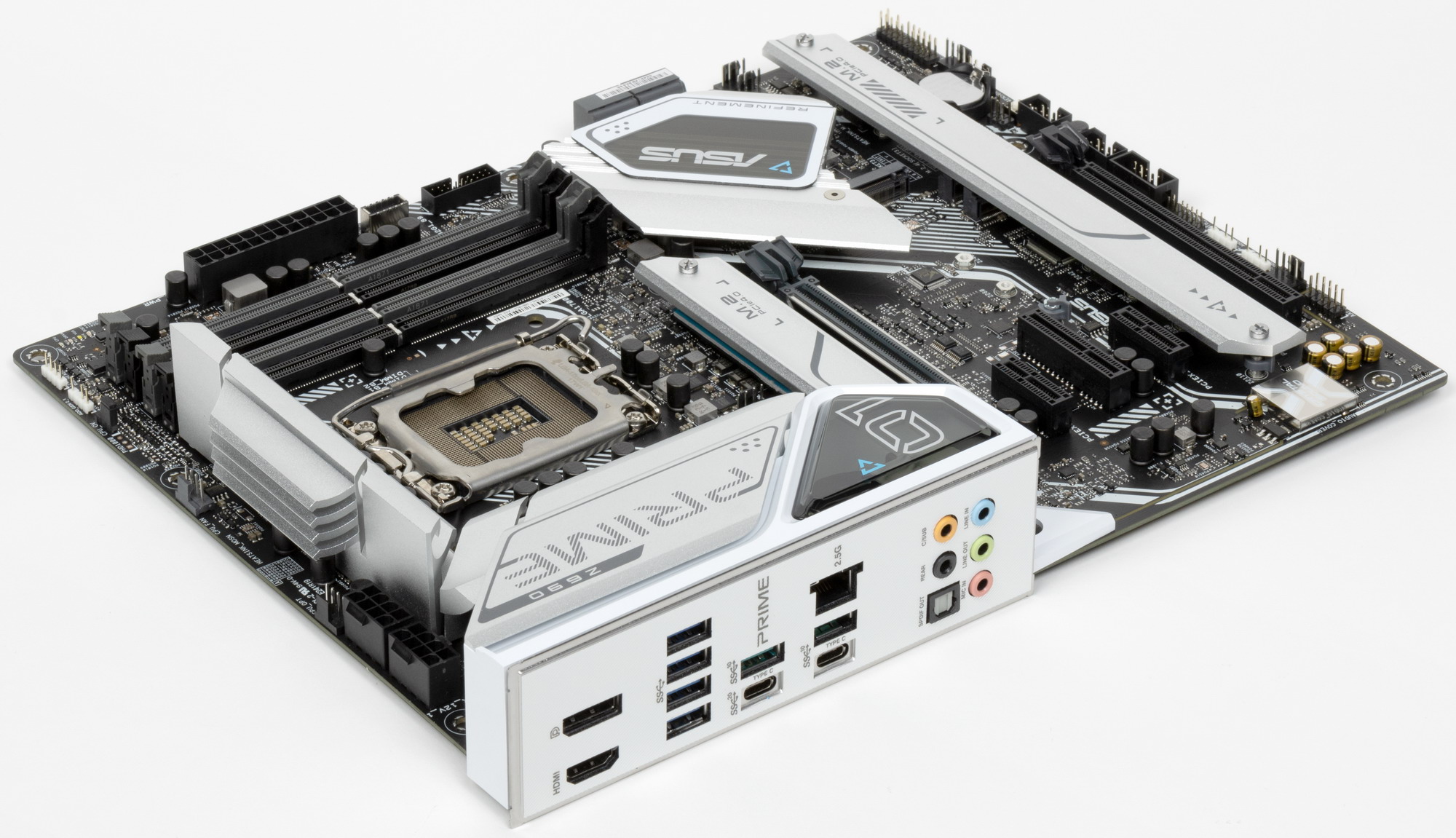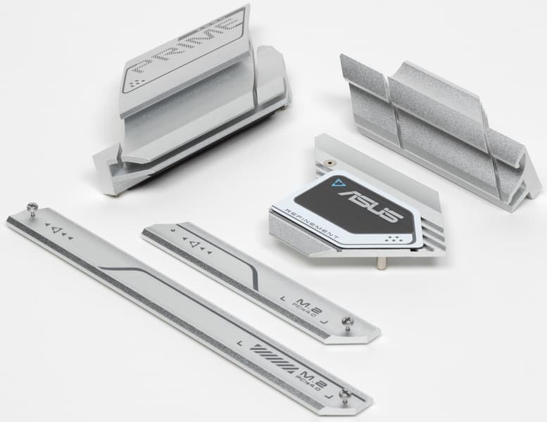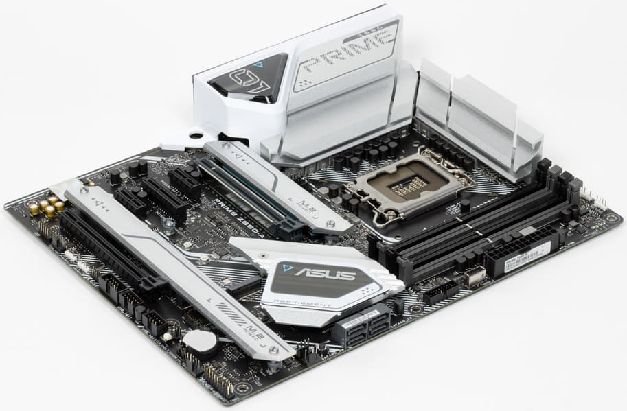 Серия Prime чисто внешне давно выделена бело-серебристой расцветкой устройств охлаждения и довольно пестрым черно-белым рисунком/узором на самой печатной плате.