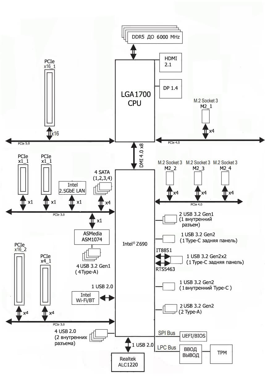 Процессоры Intel Core 12-го поколения (совместимые с сокетом LGA1700 и поддерживаемые Z690) имеют 20 линий ввода-вывода (16 PCIe 5.0, 4 PCIe 4.0), не имеют USB и SATA портов. При этом взаимодействие с Z690 идет по особому каналу Digital Media Interface 4.0 (DMI 4.0 x8). Все PCIe линии процессора идут на слоты расширения PCIe и порт М.2. Serial Peripheral Interface (SPI) используется для взаимодействия с системой UEFI/BIOS, а шина Low Pin Count (LPC) — для связи с устройствами ввода/вывода, не требующими высокой пропускной способности (контроллерами вентиляторов, TPM, старой периферии).