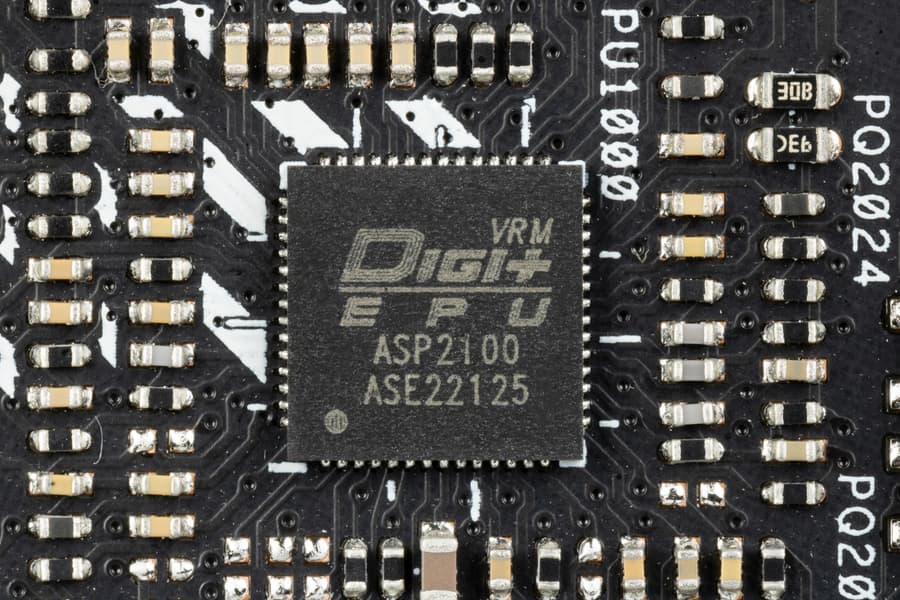 Управляет схемой фирменный ШИМ-контроллер DiGi+ ASP2100, рассчитанный максимум на 12 — 16 фаз (по разным сведениям).