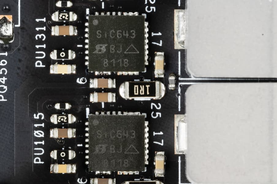 Каждый канал фазы имеет суперферритовый дроссель и SiC640 MOSFET от Vishay на 60 А.