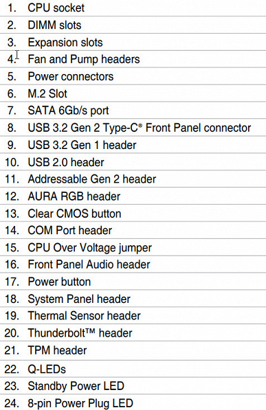 | Прочие внутренние элементы | 24-контактный разъем питания ATX 2 8-контактный разъем питания EPS12V 1 разъем для подключения порта USB 3.2 Gen2 Type-C 1 разъем для подключения 2 портов USB 3.2 Gen1 2 разъема для подключения 4 портов USB 2.0 8 разъемов для подключения 4-контактных вентиляторов и помп ЖСО 1 разъем для подключения неадресуемой RGB-ленты 3 разъема для подключения адресуемой ARGB-ленты 1 разъем аудио для передней панели корпуса 1 разъем Thunderbolt 1 разъем COM-port 1 разъем TPM для устройств безопасности 1 разъем для термодатчикa 2 разъема для подключения управления с передней панели корпуса |