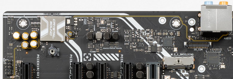 Аудиотракт вынесен на угловую часть платы, не пересекается с другими элементами. Все аудиоразъемы на задней панели имеют привычную цветовую окраску.