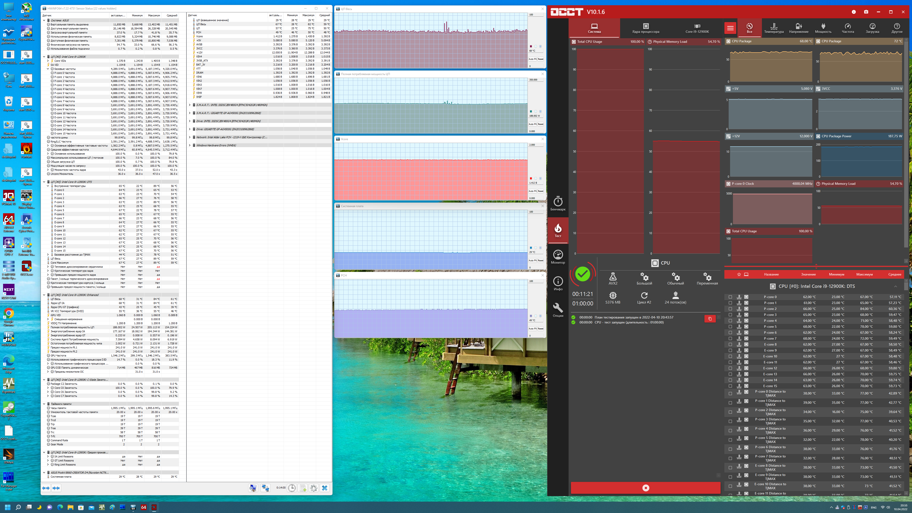 Как мы видим, автоматический разгон даже самого мощного на сегодня 12900К получился приличный: до 4,9/3,7 ГГц. При этом наша мощная СВО прекрасно справлялась с нагрузкой.