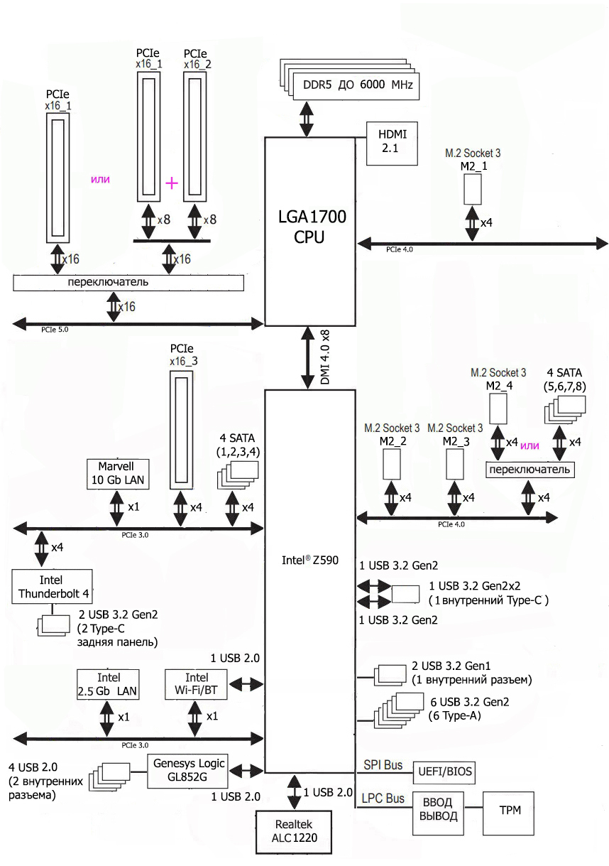 Процессоры Intel Core 12-го поколения (совместимые с сокетом LGA1700 и поддерживаемые Z690) имеют 20 линий ввода-вывода (16 PCIe 5.0, 4 PCIe 4.0), не имеют USB и SATA портов. При этом взаимодействие с Z690 идет по особому каналу Digital Media Interface 4.0 (DMI 4.0 x8). Все PCIe линии процессора идут на слоты расширения PCIe и порт М.2. Serial Peripheral Interface (SPI) используется для взаимодействия с системой UEFI/BIOS, а шина Low Pin Count (LPC) — для связи с устройствами ввода/вывода, не требующими высокой пропускной способности (контроллерами вентиляторов, TPM, старой периферии).