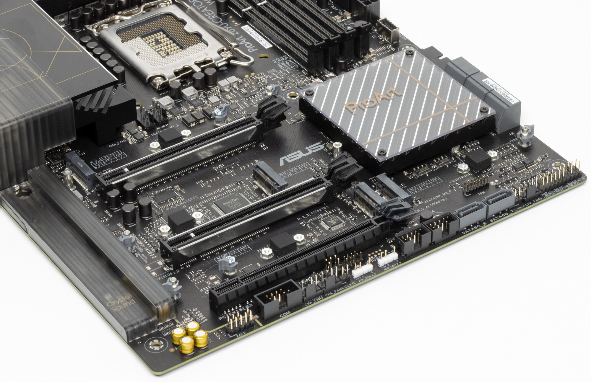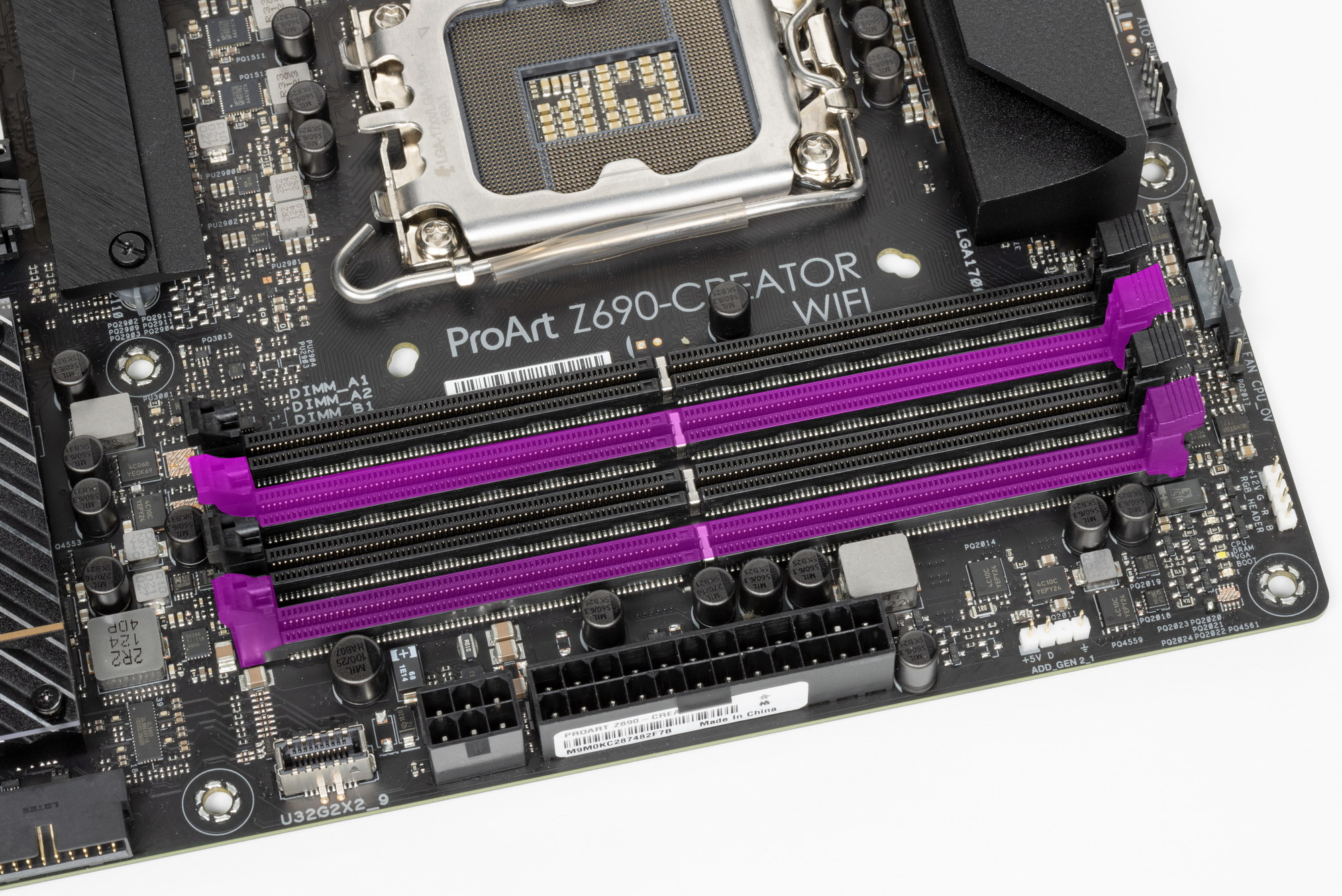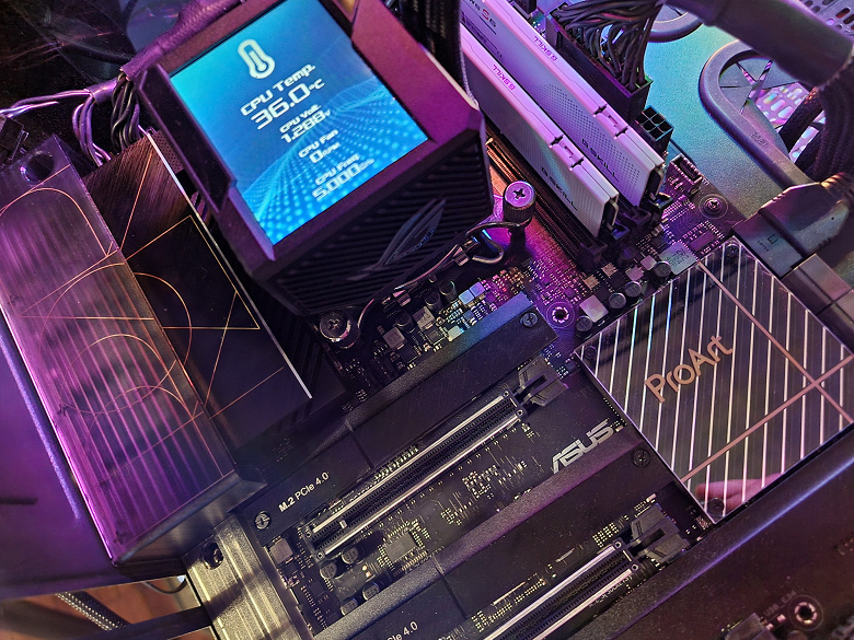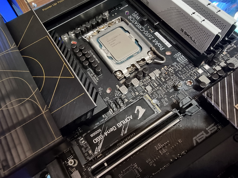 Еще раз надо напомнить, что Asus ProArt Z690-Creator WiFi поддерживает процессоры Intel Core 12-го поколения, выполненные под разъем (сокет) LGA1700. Звучали заявления, что система крепления систем охлаждения для CPU несовместима с той, что для LGA1151/1200, поэтому для совместимости со старыми СО у данной платы имеются овальные отверстия вокруг сокета. Также из-за того, что новые процессоры 12ххх на 0.8 мм тоньше предшественников, некоторые кулеры с жесткой установкой в матплате на фиксированную высоту могут не достать до крышек процессоров 12ххх. Подойдут лишь СО с пружинистой посадкой подошвы на процессор.