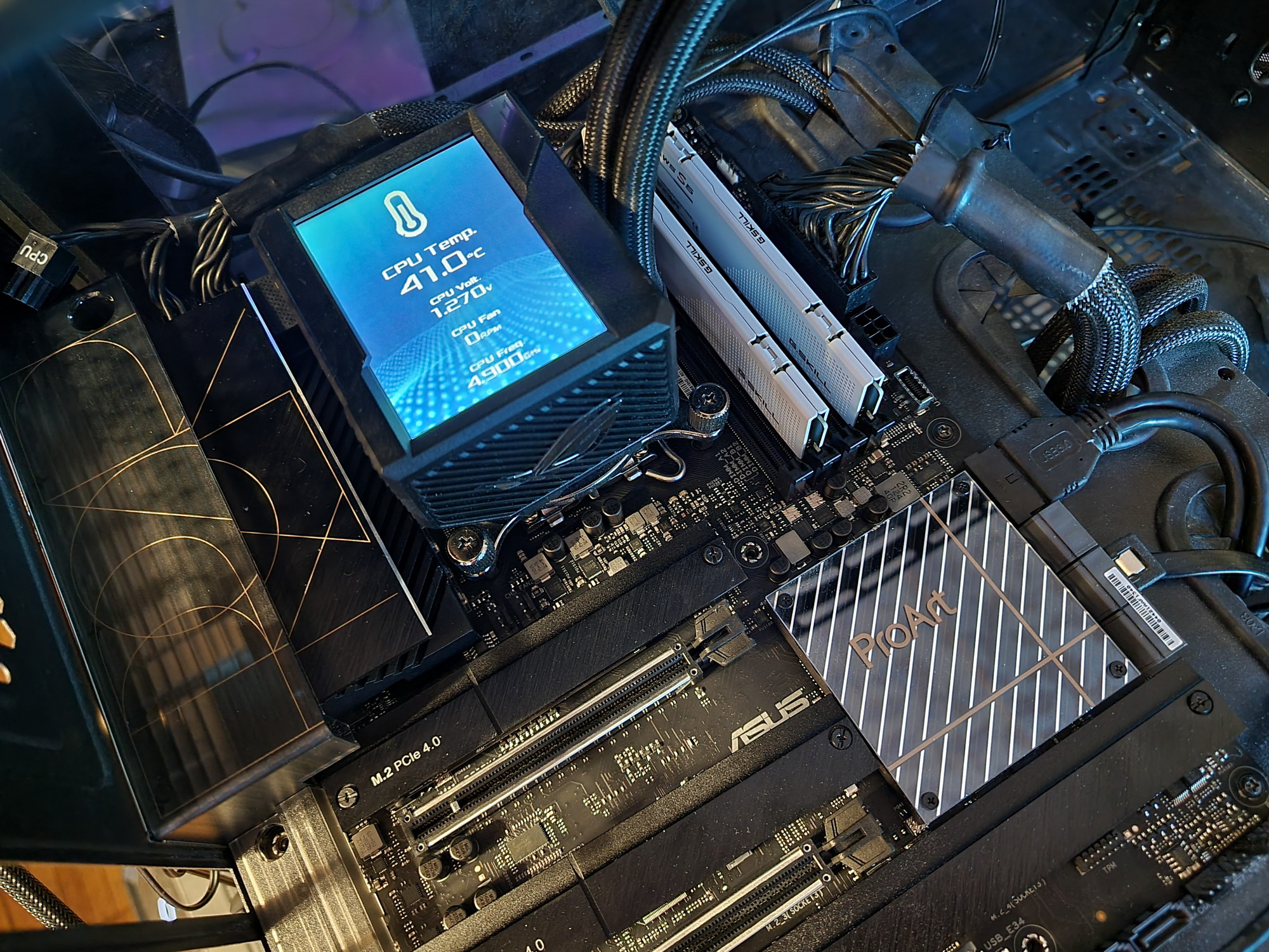 Эта модель не относится к семейству ROG, но система питания процессора у нее очень мощная, способная обеспечить работу любых совместимых процессоров с приличным запасом на разгон. Плата имеет эффективную систему охлаждения каждого потенциально греющегося элемента, включая накопители в слотах M.2. Стоит отметить и отличные сетевые возможности: два проводных скоростных контроллера 2,5 и 10 Гбит/с, а также один самый современный беспроводной. Поддержка Thunderbolt 4 позволяет передавать данные на скорости 40 Гбит/с, также имеется возможность выводить картинку на приемник с интерфейсом Thunderbolt 4. По поводу подсветки можно сказать, что плата поддерживает подключение разных современных наборов ARGB/RGB, но сама по себе подсветки лишена.
