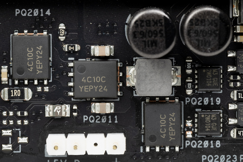 Для питания платы на ней предусмотрены 4 разъема: в дополнение к 24-контактному ATX (он на правой стороне платы (на фото — слева) здесь есть еще два EPS12V (8- и 4- контактные), а также 6-контактный разъем питания PCIe. Снова хочу особо упомянуть, что последний нужен не только для усиления подсистемы питания слотов PCIe x16 для видеокарт, но и в большей степени для обеспечения быстрой зарядки (до 60 Вт) через порт USB 3.2 Gen2x2 (внутренний Type-C).