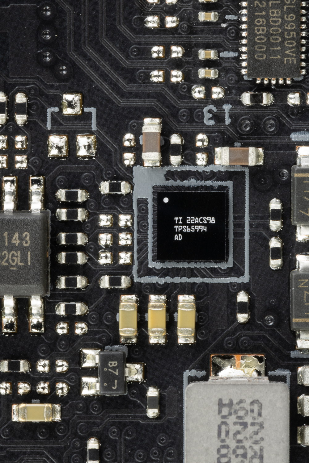 Для поддержания стабильности шины PCIe 4.0 имеется усилитель сигнала DS80PCI402 от Texas Instruments.