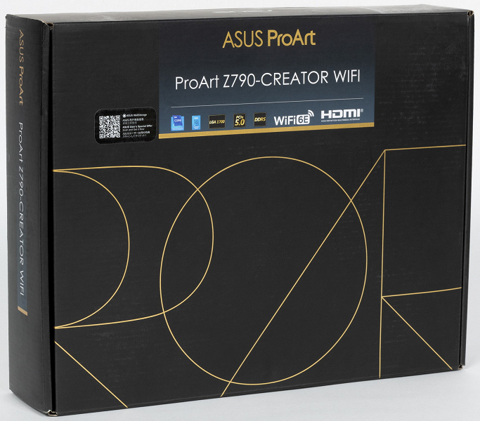 Плата поставляется в стандартной коробке строгого черно-золотого дизайна серии ProArt. Комплект размещен под платой в отдельном отсеке.
