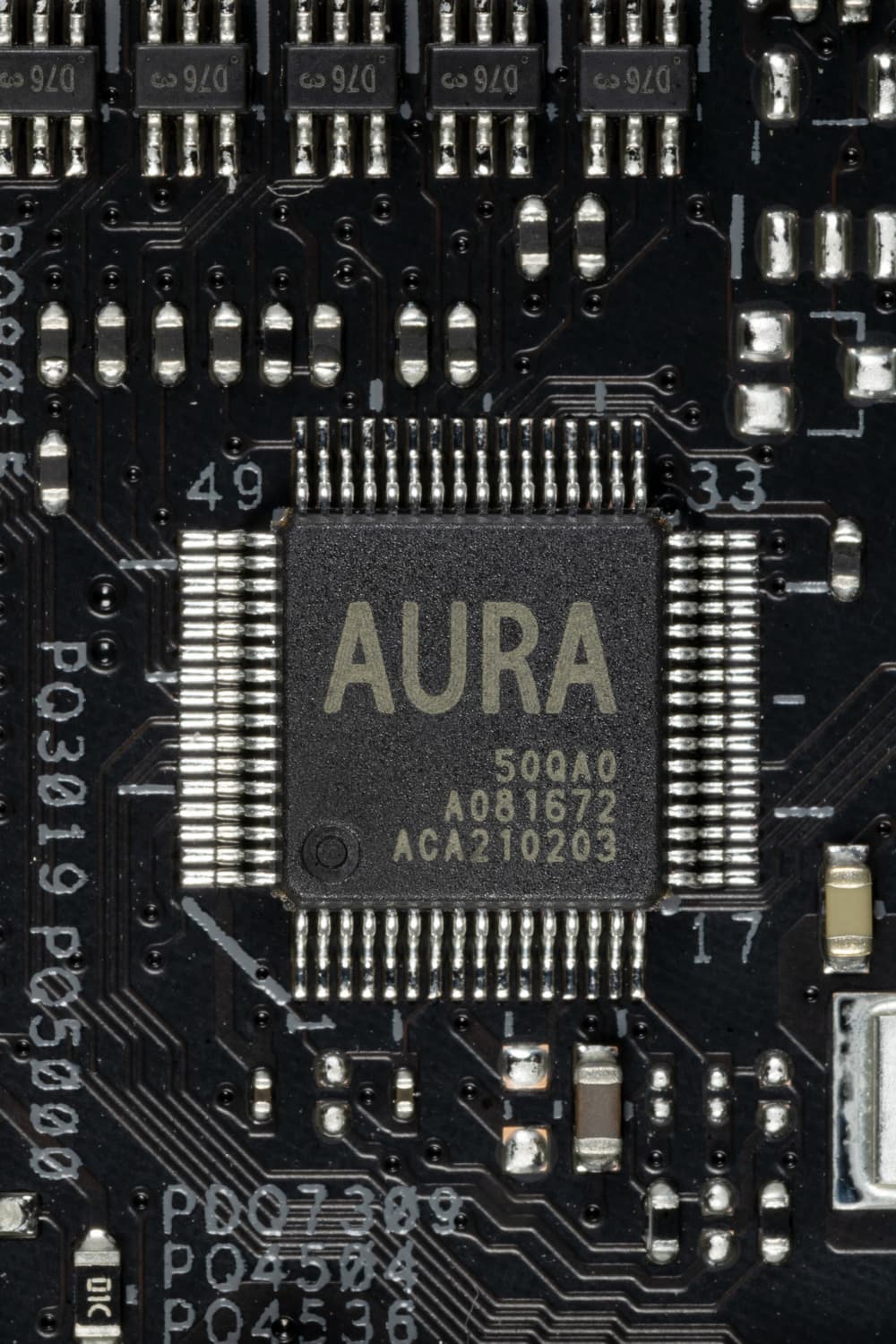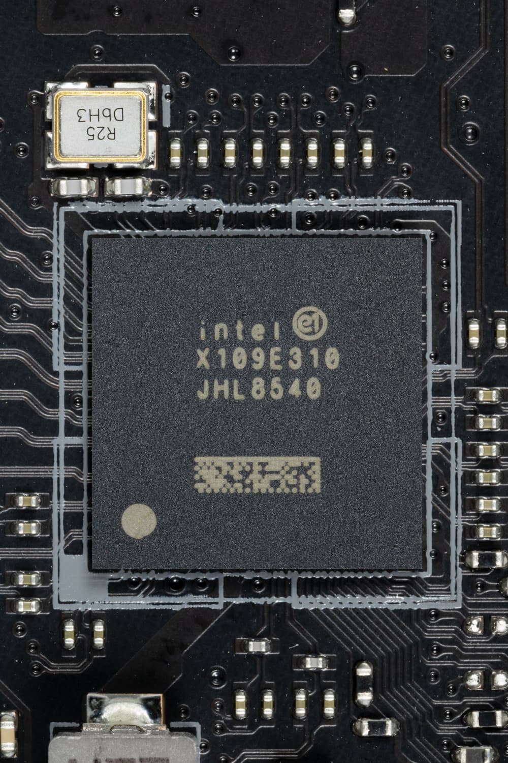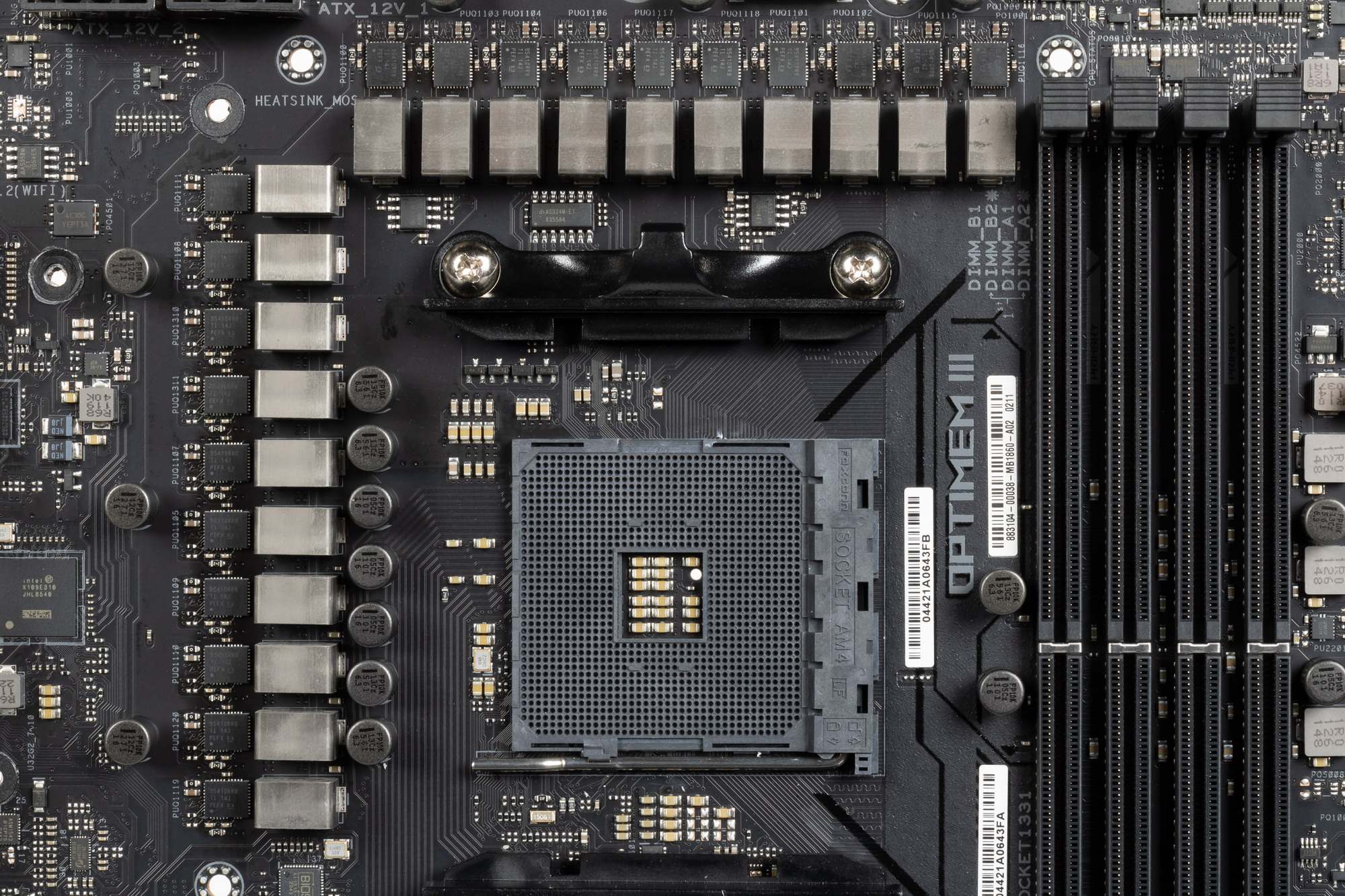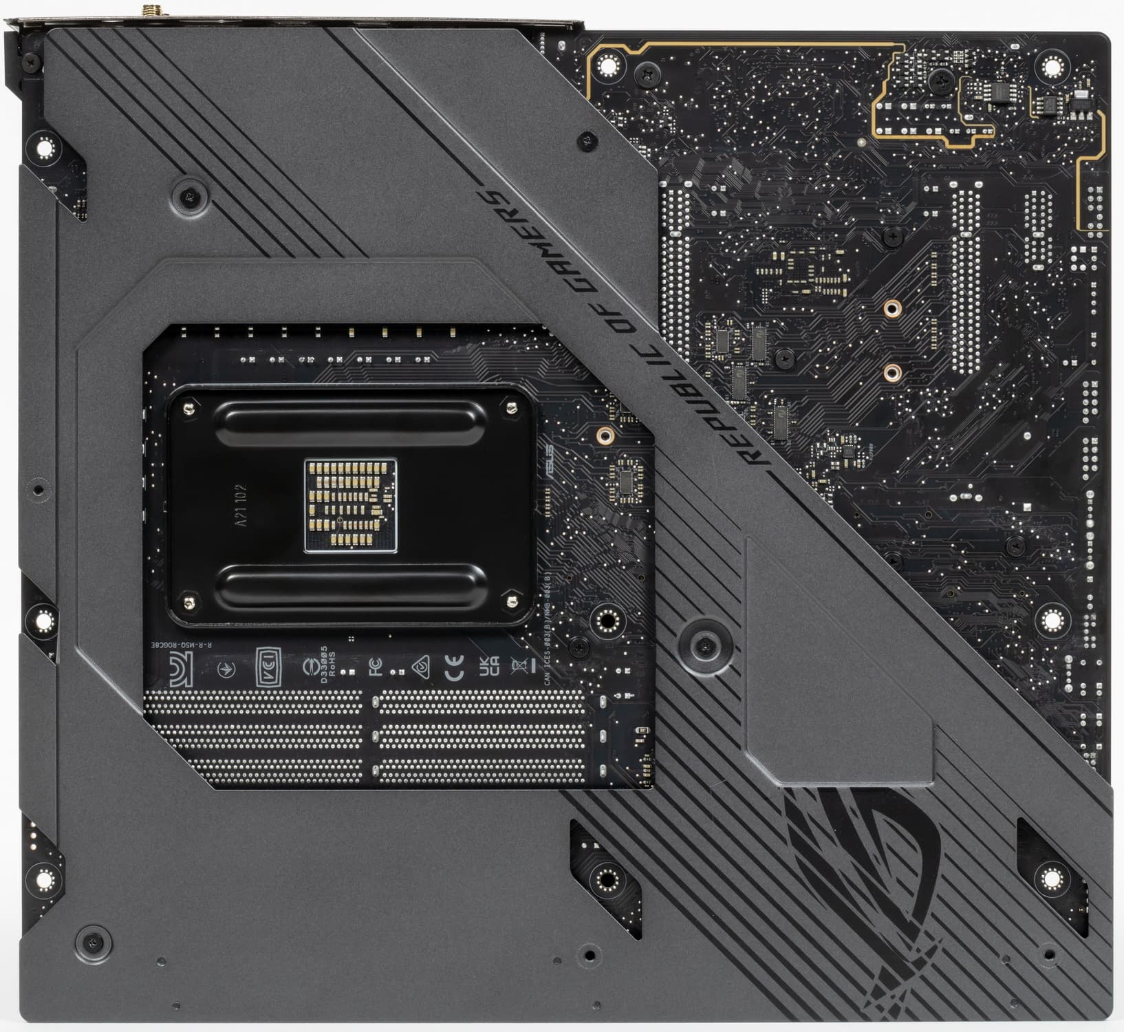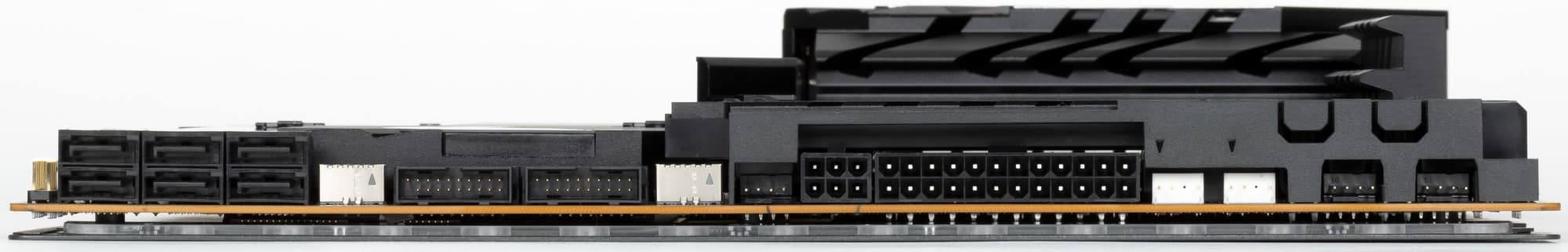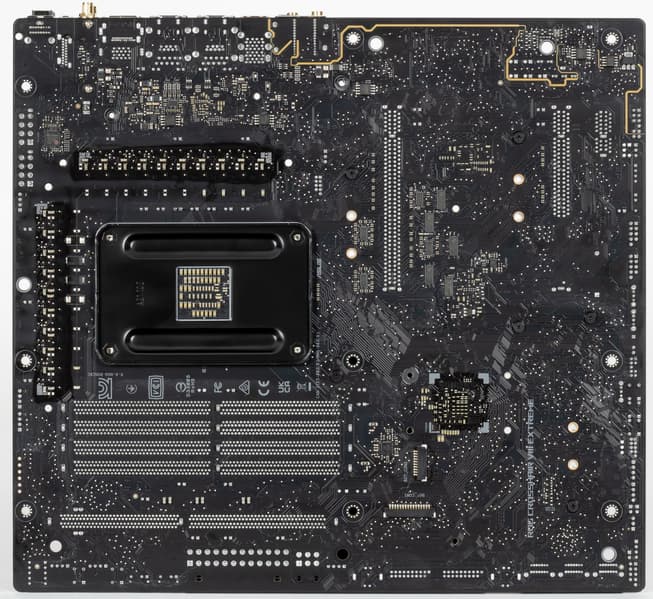 На оборотной стороне расположена некоторая логика. Текстолит обработан хорошо: во всех точках пайки не только острые концы срезаны, но и все неплохо отшлифовано. На задней стороне установлена пластина из алюминия с наноуглеродным покрытием. Она пластина помогает отводить тепло от задней стороны PCB через термоинтерфейс и обеспечивает жесткость материнской платы. И я еще раз заострю внимание на том, что такую матплату вряд ли получится установить в корпусе, где в качестве опор для материнских плат используются не привычные всем латунные втулки, а выпрессованные возвышения, которые (по опыту) много шире, нежели выемки в задней пластине у материнки.