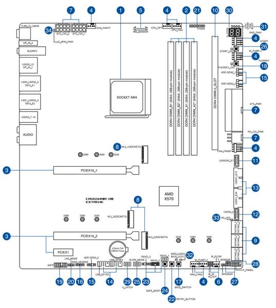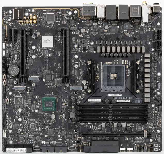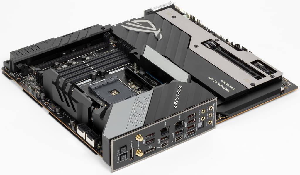 У Asus ROG Crosshair VIII Extreme имеется 20 портов USB разных видов, включая 11 очень быстрых USB 3.2 Gen2, два из которых поддерживают Thunderbolt 4, а еще есть один самый быстрый USB 3.2 Gen2×2 — правда, в виде внутреннего Type-C, для вывода которого еще придется поискать корпус. Плата предлагает 2 слота PCIe х16 (они получают от процессора 16 линий PCIe), слот PCIe x1, аж 5(!) слотов M.2 (один из них подключен напрямую к процессору линиями PCIe 4.0, еще два также могут подключаться к процессору, но для этого придется уменьшить количество линий PCIe для слотов PCIe x16).