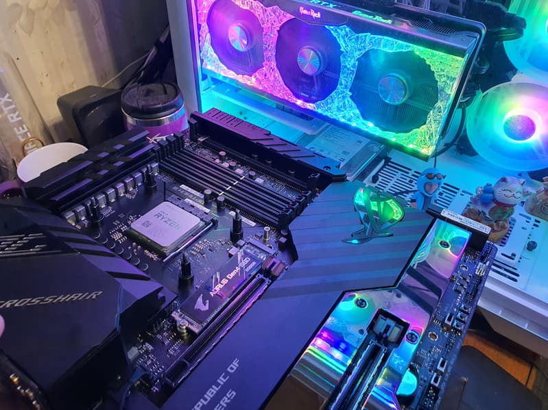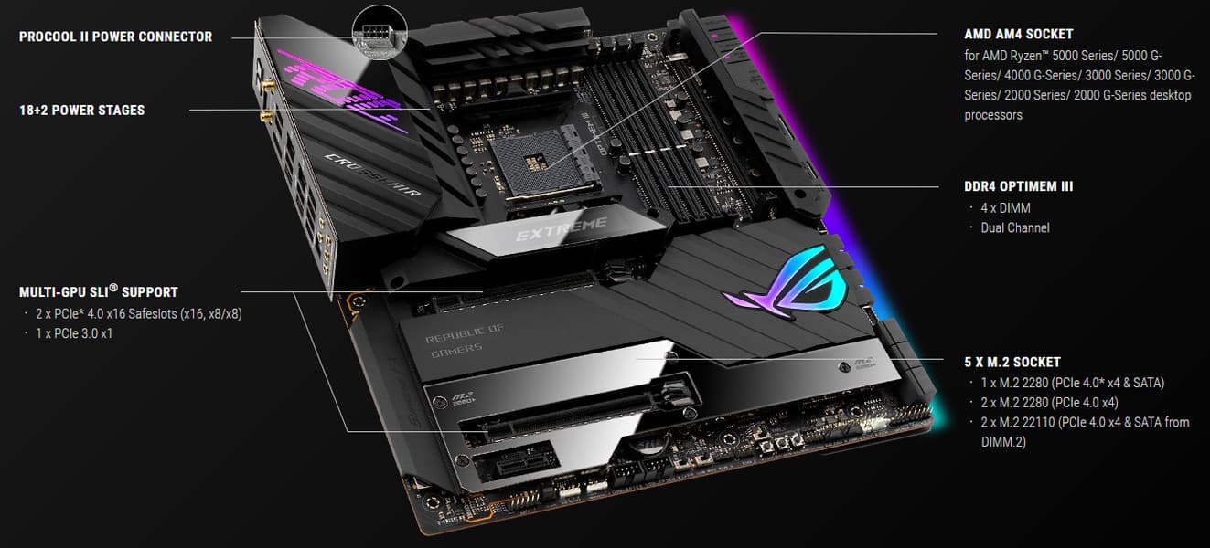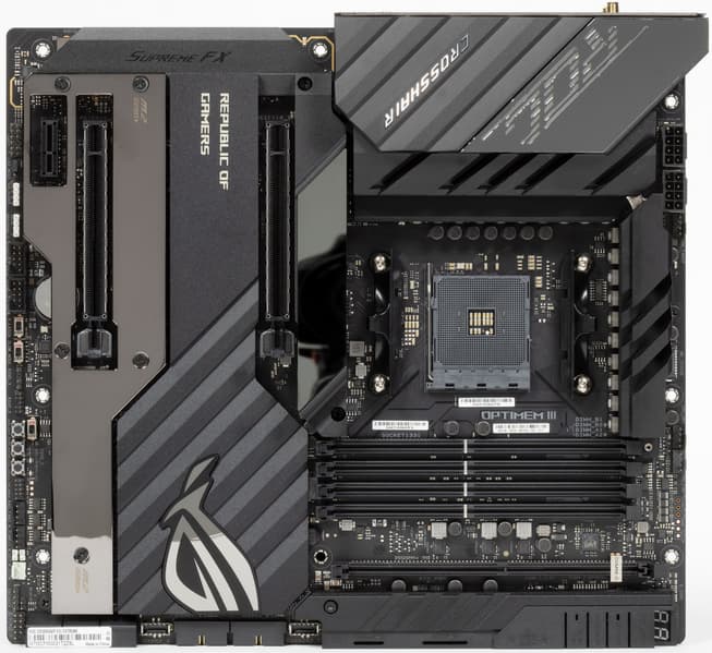 Материнская плата Asus ROG Crosshair VIII Extreme — флагманский, самый навороченный представитель топовой серии ROG для процессорного разъема AM4 со стоимостью в районе 60 тысяч рублей. Плата просто напичкана всеми современными разработками, поддерживает процессоры AMD Ryzen серий 3000 и 5000 (2000-я серия поддерживается неофициально) и создана для хардкорных геймеров и энтузиастов-оверклокеров. Потенциал системы охлаждения и арсенал опций для разгона явно нацелены на экстремалов.