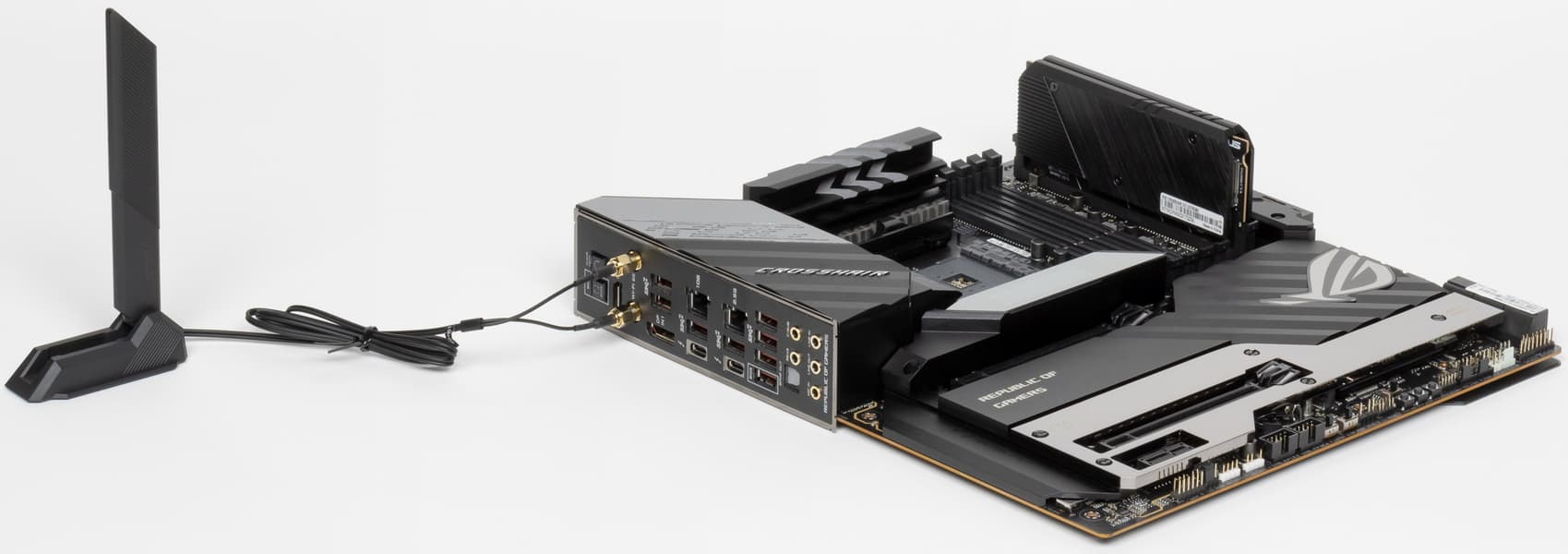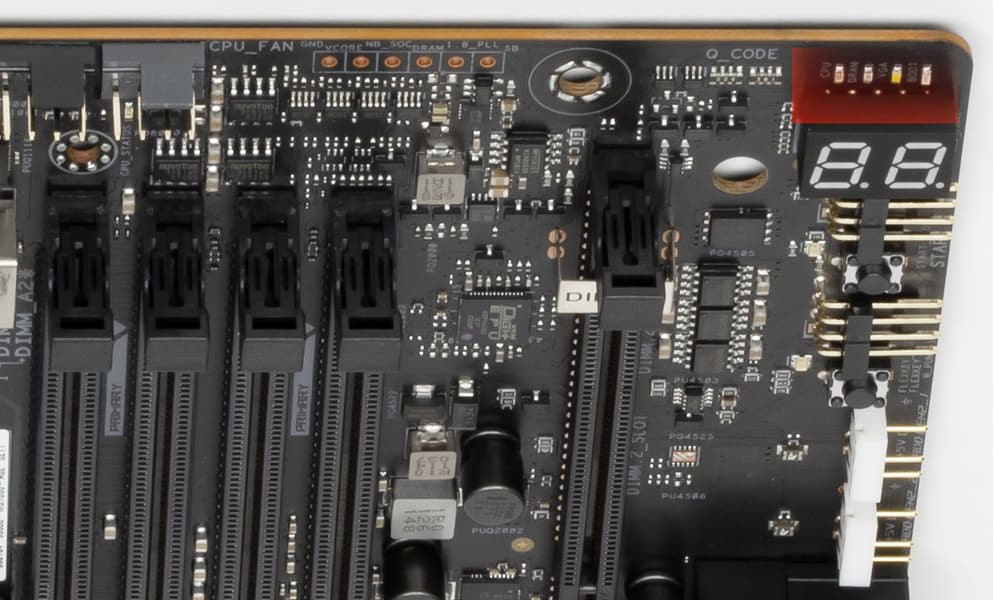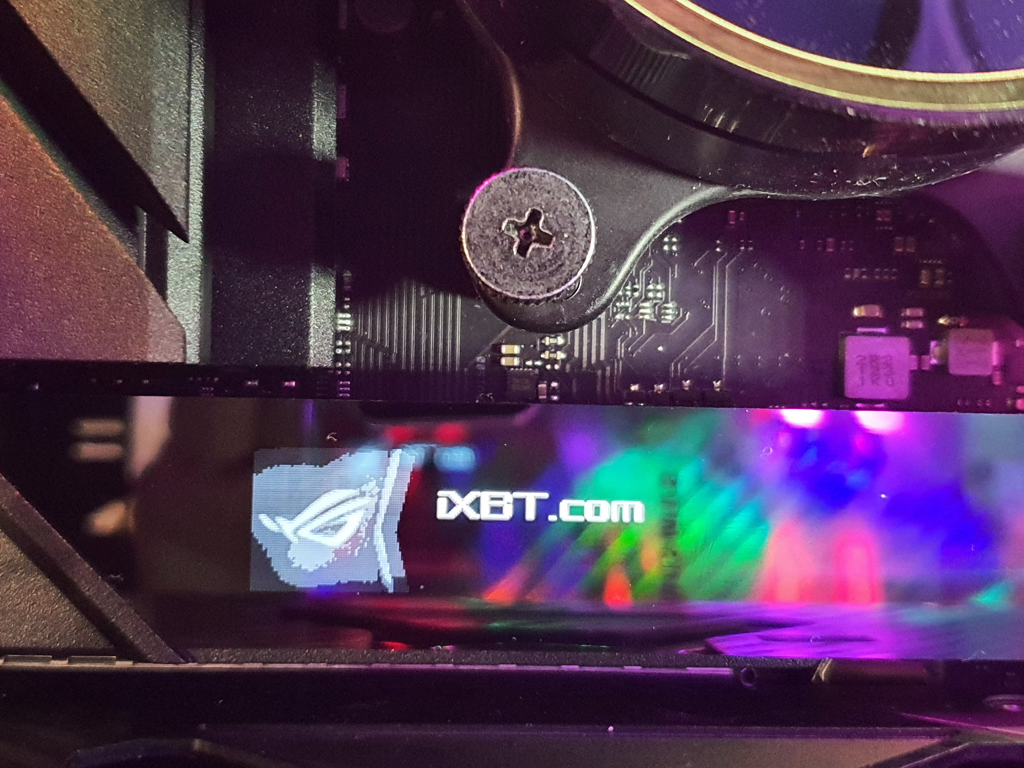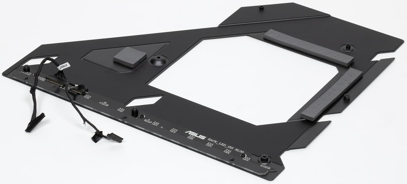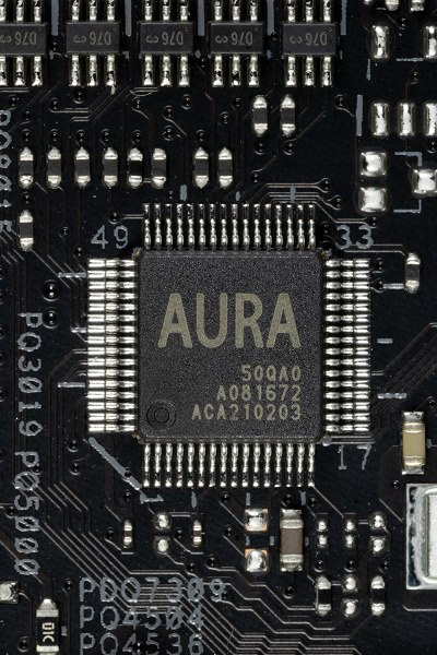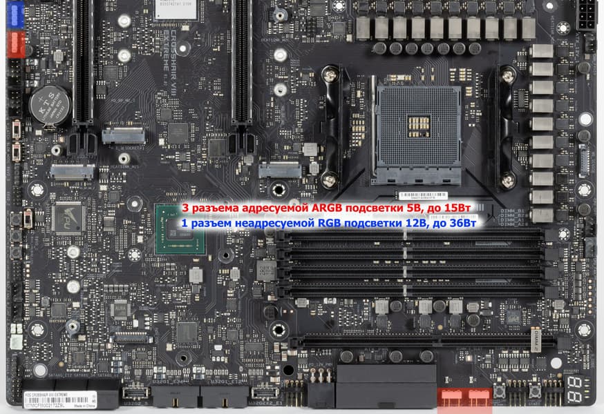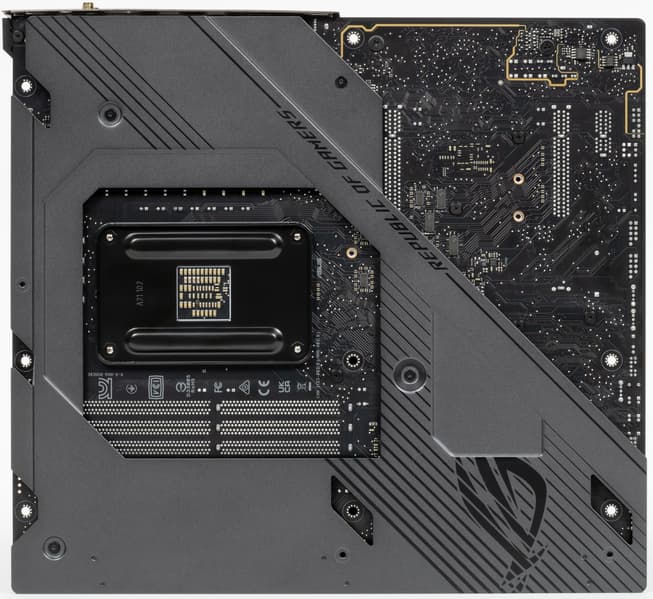 Материнская плата имеет бэкплейт с оборотной стороны, который не только защищает PCB от повреждений, но является вспомогательным охладителем VRM, а также несет элементы подсветки.