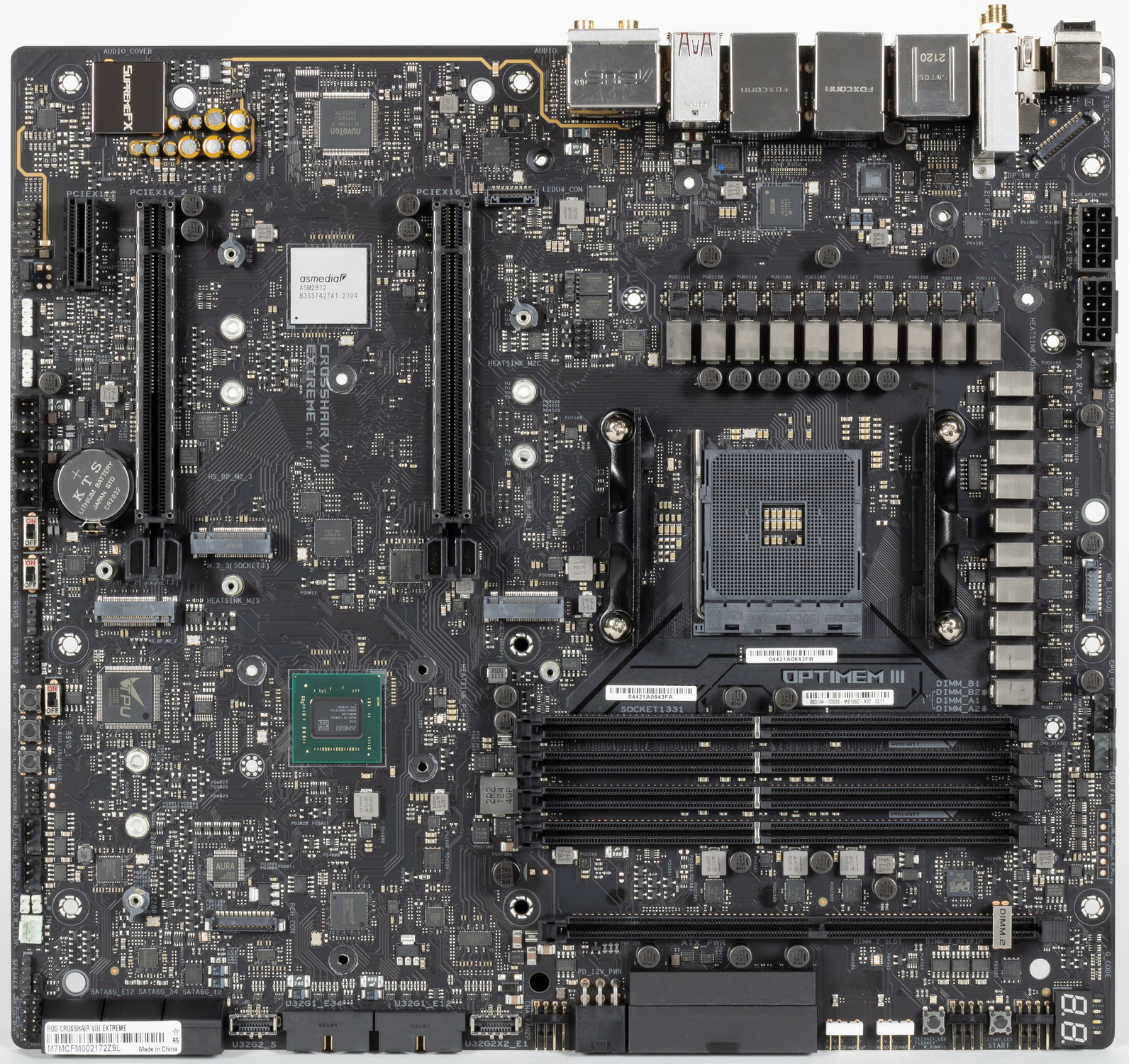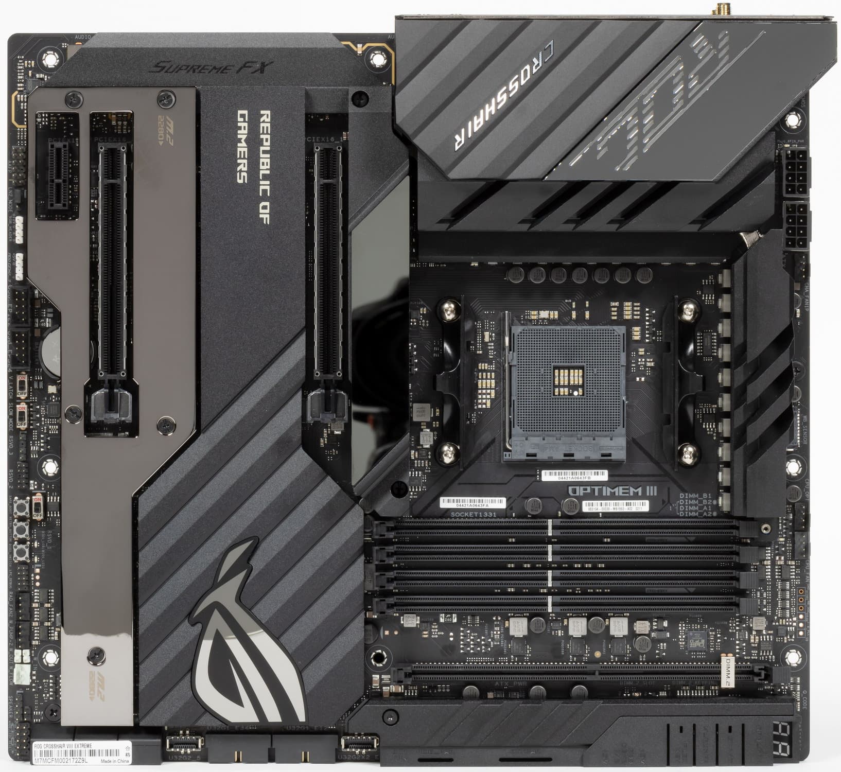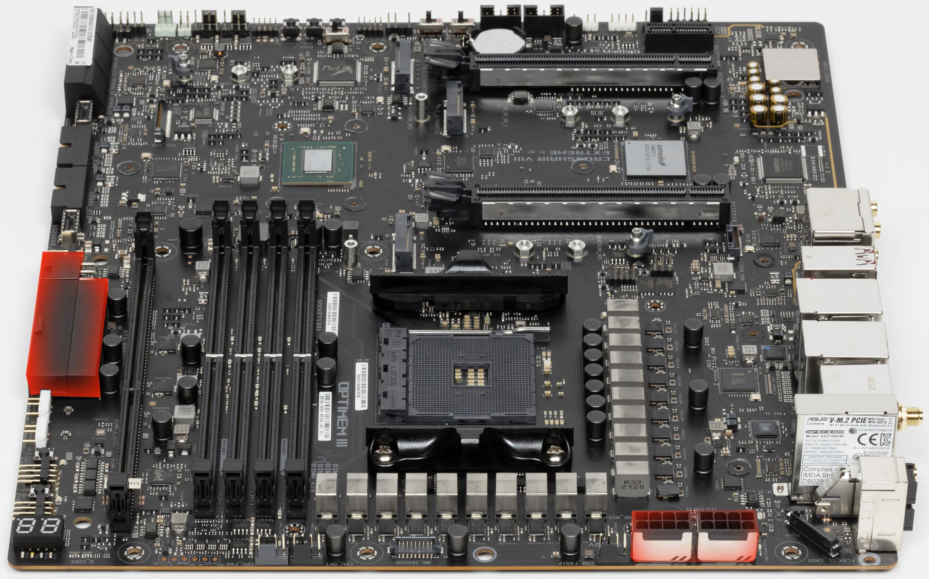 Форм-фактор ATX имеет размеры до 305×244 мм, а E-ATX — до 305×330 мм. Материнская плата Asus ROG Crosshair VIII Extreme имеет размеры 305×277 мм, поэтому выполнена в форм-факторе E-ATX, и на ней имеются 9 монтажных отверстий для установки в корпус. Однако следует иметь в виду, что одно из девяти монтажных отверстий перекрыто радиатором для слота M.2_1 (на нем же информационный экранчик).