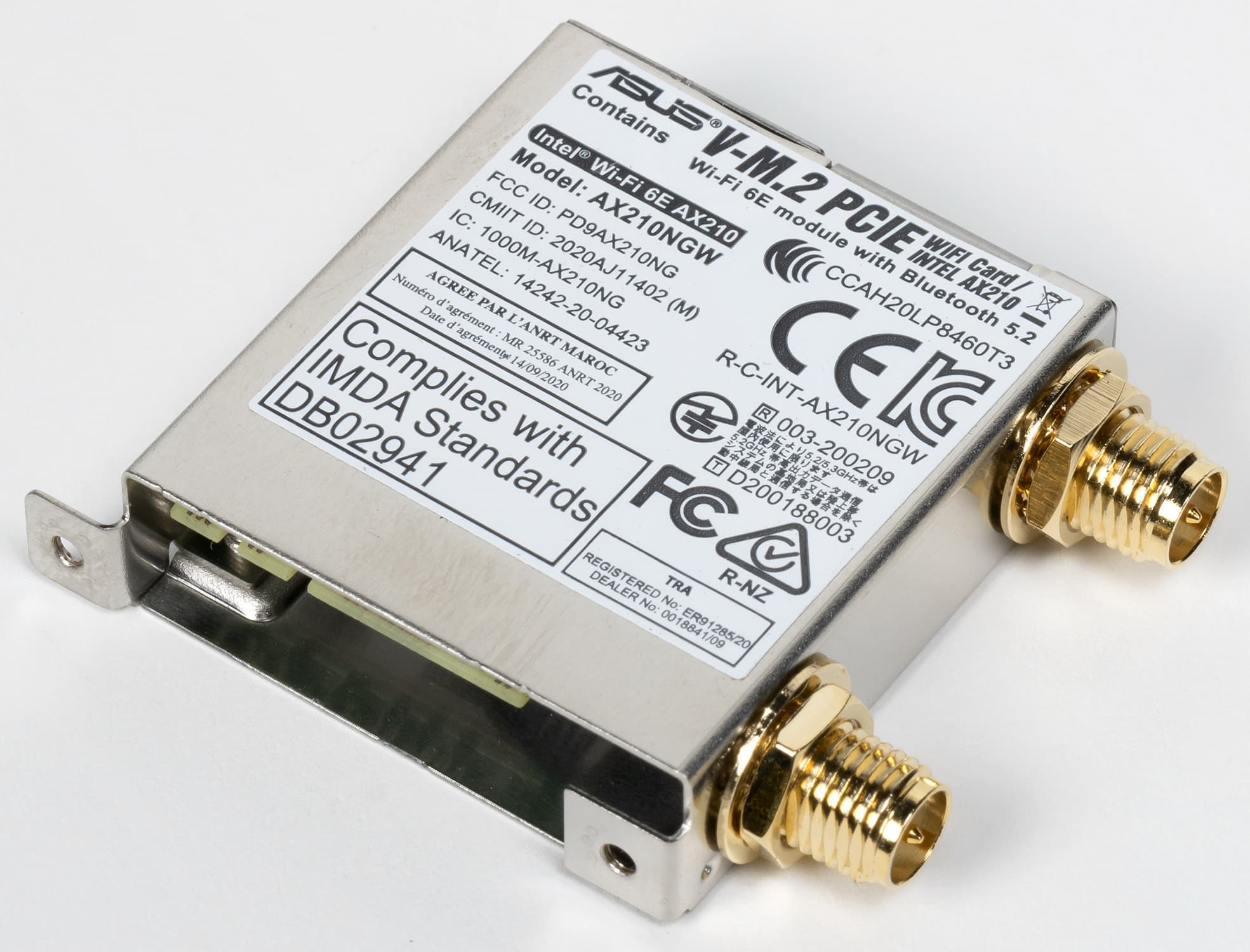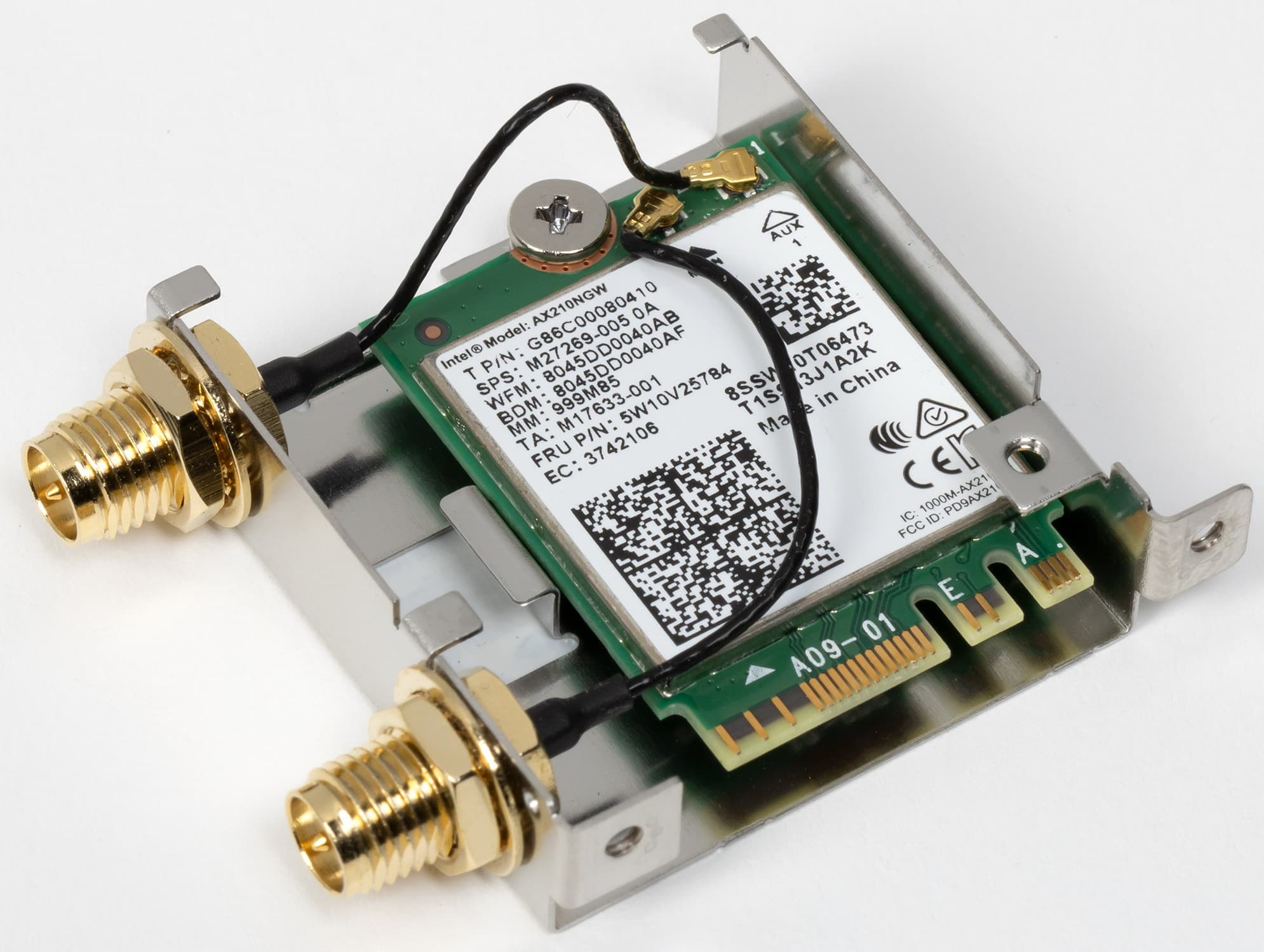 Имеется и комплексный беспроводной адаптер на контроллере Intel AX-210NGW, через который реализованы Wi-Fi 6E (802.11a/b/g/n/ac/ax) и Bluetooth 5.2. Он установлен в слот M.2 (E-key), и его разъемы для привинчивания выносных антенн выведены на заднюю панель.