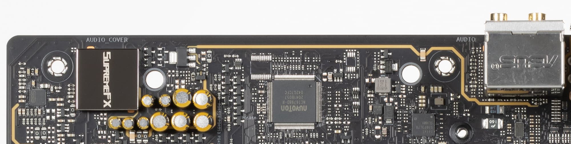 Аудиотракт вынесен на угловую часть платы, не пересекается с другими элементами. Все аудиоразъемы на задней панели имеют позолоченное покрытие, а привычная цветовая окраска создана с помощью подсветок у этих разъемов.