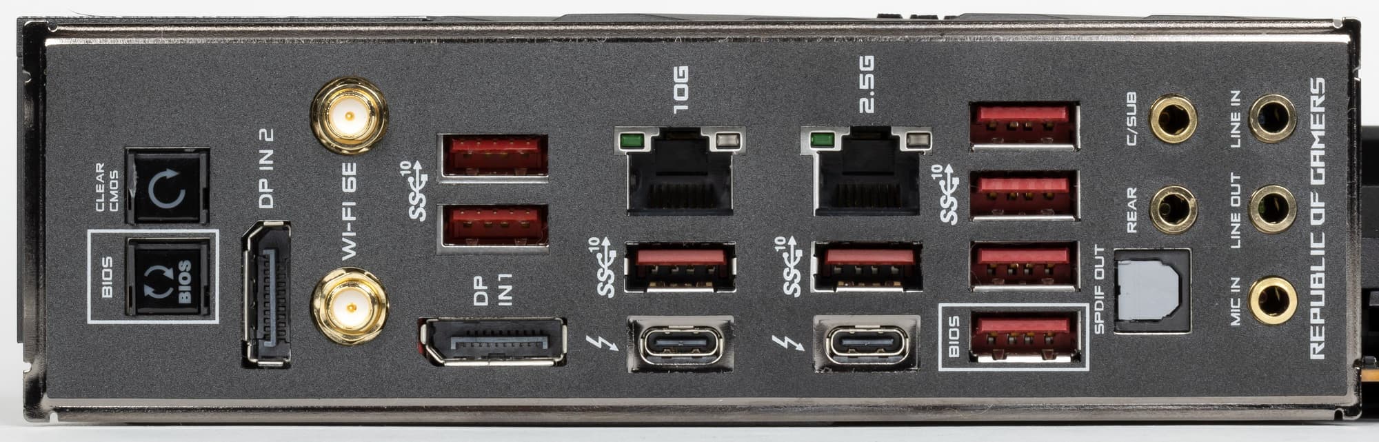 | Разъемы на задней панели | 2 × USB 3.2 Gen2 (Type-C) 8 × USB 3.2 Gen2 (Type-A) 2 × RJ-45 5 аудиоразъемов типа миниджек 1 × S/PDIF (оптический, выход) 2 × DisplayPort In 2 антенных разъема кнопка сброса CMOS кнопка перепрошивки BIOS — Flashback |