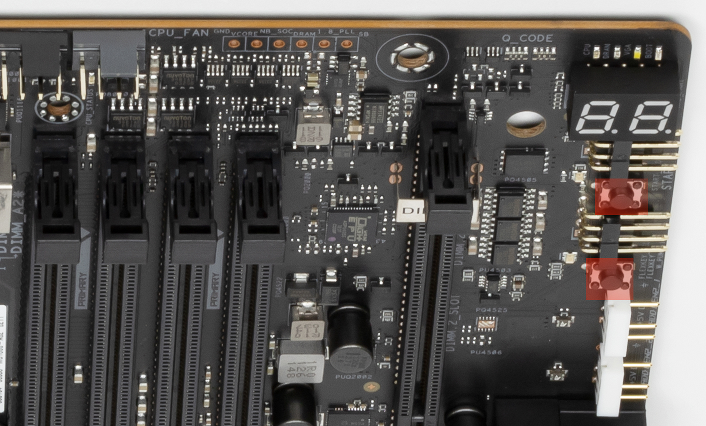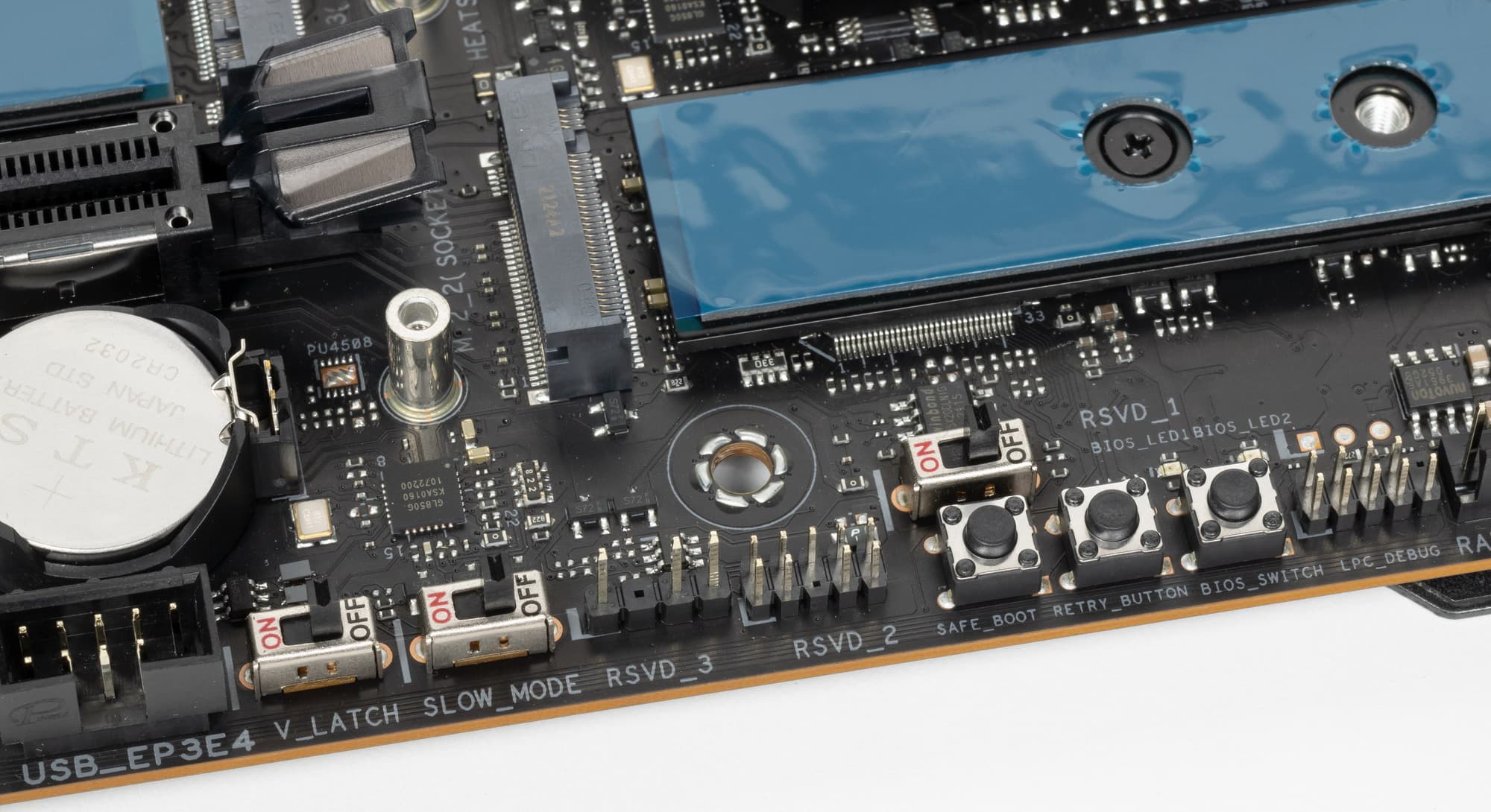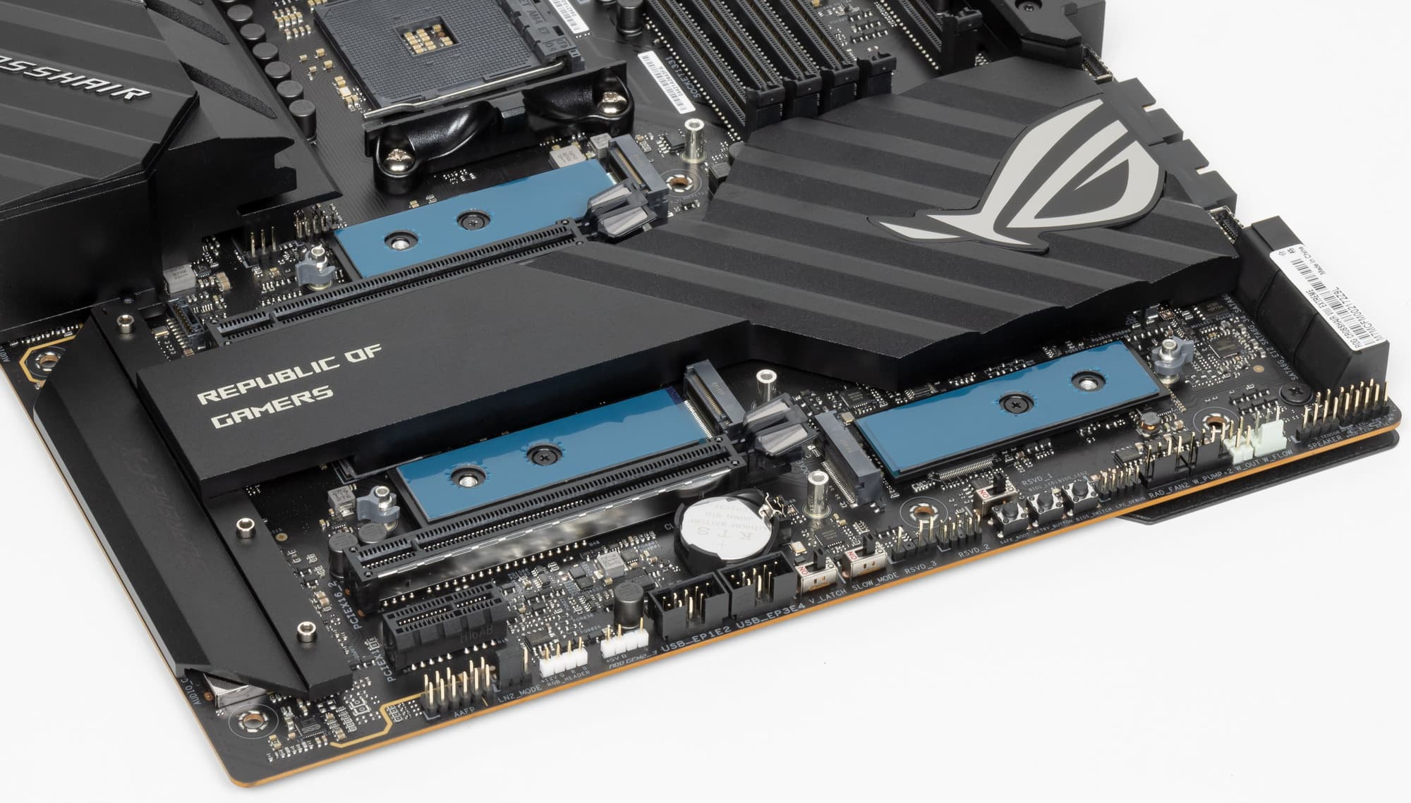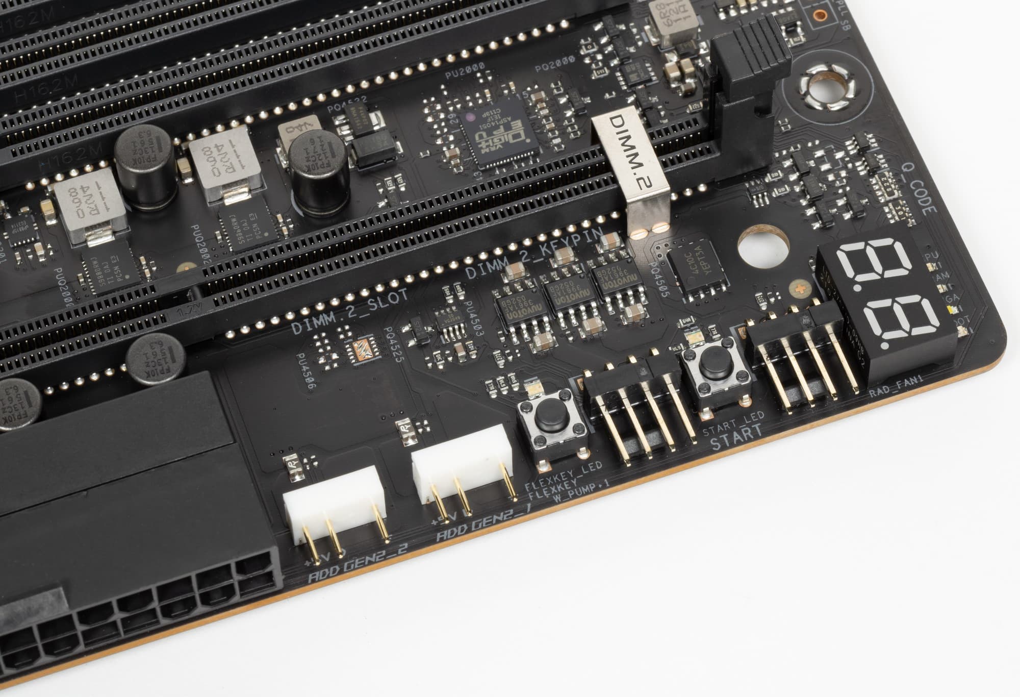 Все M.2 слоты имеют радиаторы. Верхний M2_1 обладает отдельным радиатором (где OLED экран), когда как остальные два нижних слота M.2 имеют общий радиатор.