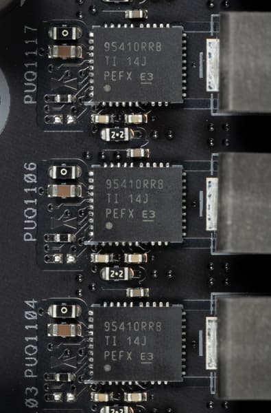 Поэтому питание честное, без множителей или каких-то ухищрений. Причем, как для блока I/O, так и для VCore. Каждая фаза имеет по транзисторной сборке Texas Instruments X95410RR (до 90А).