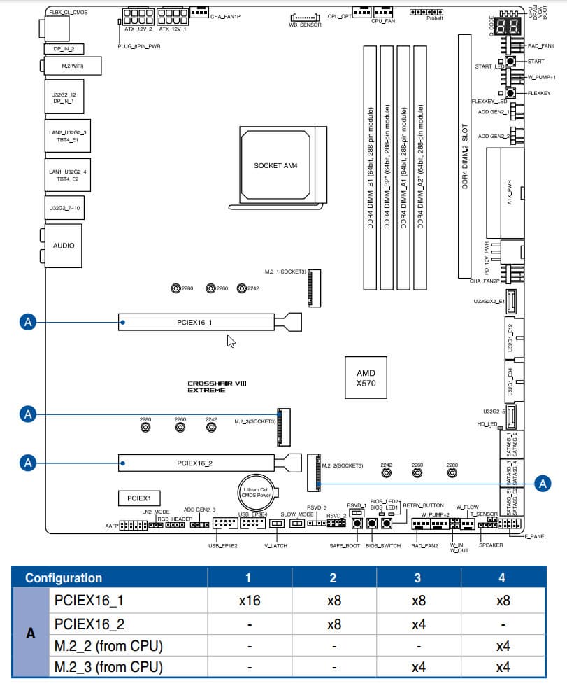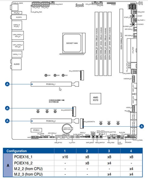 Теперь посмотрим выше на то, как работают процессоры в данной конфигурации. У всех Ryzen – 20 линий PCIe (плюс 4 линии на даунлинк с чипсетом). 4 линии уходят на слот M.2_1, а остальные 16 линий надо делить на два слота PCIe x16 (_1 и _2), а также на два порта М2_2/2_3 (которые также «питаются данными» от процессора). Вариантов переключения несколько: