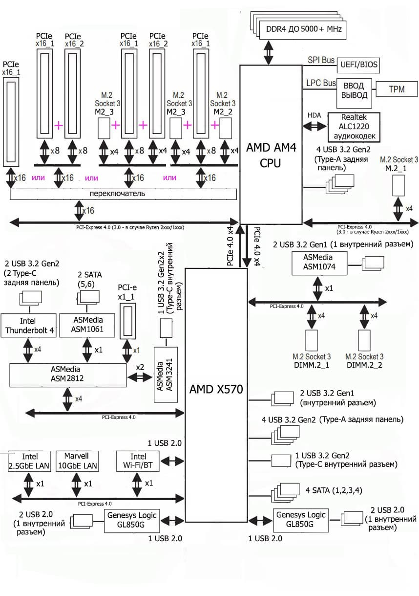 Процессоры Ryzen 3000/5000 поддерживают 4 порта USB 3,2 Gen2, 24 линии ввода-вывода (включая PCI-E 4.0), но 4 линии из них идут на взаимодействие с X570, еще 16 линий — это PCI-E слоты для видеокарт. Осталось 4 линии: они могут конфигурироваться производителями материнских плат на выбор (либо-либо):