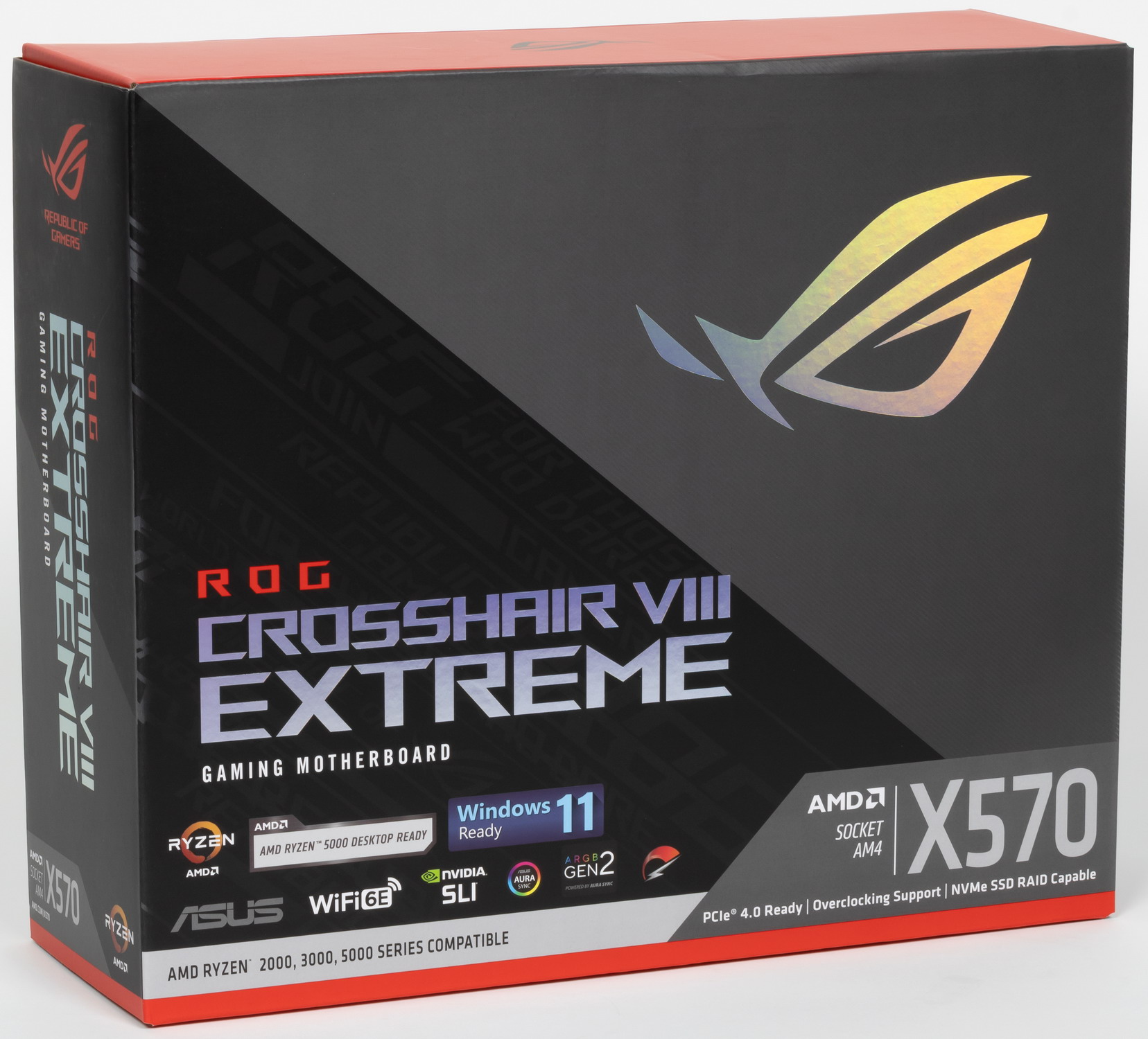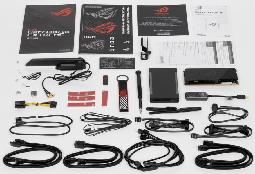 Asus ROG Crosshair VIII Extreme поставляется в традиционной для ROG очень толстой коробке из жесткого картона с фирменным черно-красным дизайном серии. Комплект размещен под платой в отдельных отсеках.