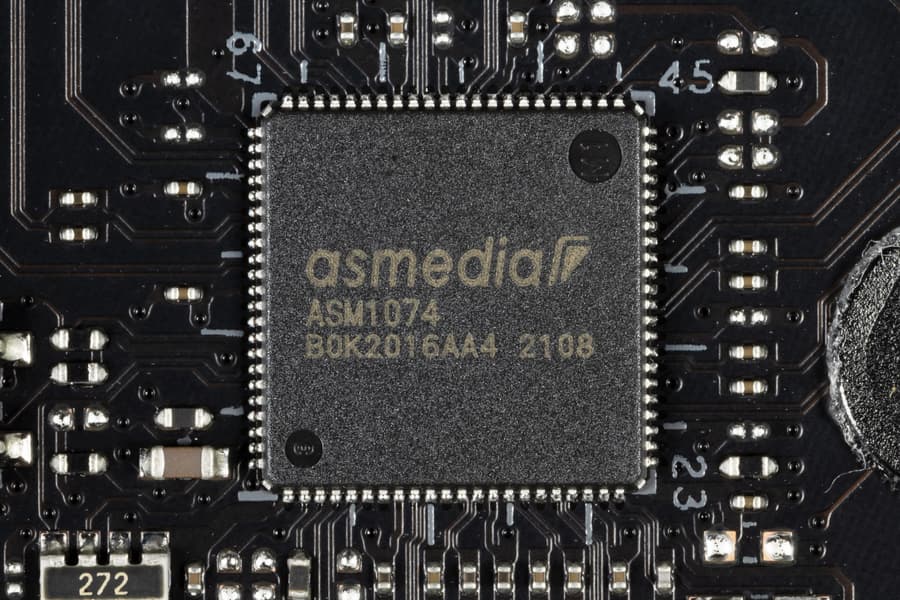 - 4 порта USB 3.2 Gen1: 2 реализованы через X570 и представлены внутренним разъемом на материнской плате (на 2 порта), а еще 2 реализованы через ASMedia ASM1074 (на него потрачена 1 линия PCIe от X570) и представлены также внутренним разъемом на материнской плате (на 2 порта);