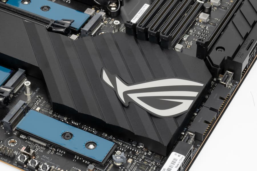 В арсенале платы есть 6 портов SATA и 8 разъемов для вентиляторов (плюс еще 6 разъемов на ROG Fan Controller). Система питания процессора невероятно мощная, она способна обеспечить работу любых совместимых процессоров с огромным запасом на разгон. Плата имеет грамотную систему охлаждения каждого потенциально греющегося элемента, включая накопители в слотах M.2 (термопрокладки для охлаждения накопителей есть с обеих сторон). Сетевые возможности отличные: два проводных контроллера 2,5 и 10 Гбит/с, а также один самый современный беспроводной. Поддержка Thunderbolt 4 позволяет передавать данные на скорости 40 Гбит/с (имеется возможность передачи видеоизображения с видеокарт на приемник с интерфейсом Thunderbolt 4). В числе плюсов платы можно упомянуть очень симпатичную подсветку, включая широкие возможности для подключения дополнительных RGB-устройств. Отметим улучшенный аудиокодек Realtek ALC4082, а также предлагаемый в комплекте ROG Clavis — игровой ЦАП, подключаемый к порту USB Type-C и с миниджеком на выходе.
