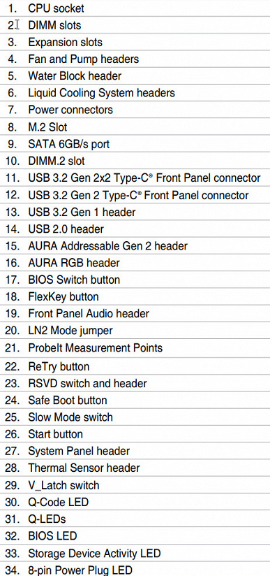 | Прочие внутренние элементы | 24-контактный разъем питания ATX 2 8-контактный разъем питания EPS12V 1 6-контактный разъем питания PCIe12V 1 слот M.2 (E-key), занят адаптером беспроводных сетей 1 разъем для подключения порта USB 3.2 Gen2x2 Type-C 1 разъем для подключения порта USB 3.2 Gen2 Type-C 2 разъема для подключения 4 портов USB 3.2 Gen1 2 разъема для подключения 4 портов USB 2.0 8 разъемов для подключения 4-контактных вентиляторов и помп ЖСО 1 разъем для подключения неадресуемой RGB-ленты 3 разъема для подключения адресуемой ARGB-ленты 1 разъем аудио для передней панели корпуса 1 разъем для сброса CMOS 1 кнопка OC Retry 1 кнопка Safe Boot 1 переключатель Slow Mode 1 переключатель V_Latch 1 разъем для термодатчикa 3 разъема подключения фирменных помп СВО Asus 2 разъема для подключения управления с передней панели корпуса 1 кнопка включения питания Power 1 кнопка перезагрузки Reset |