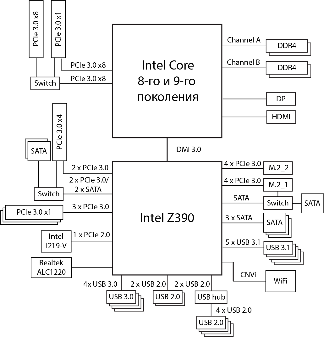 Напомним, что в чипсете Z390 имеется 30 HSIO-портов, из которых может быть до 24 портов PCIe 3.0, до 6 портов SATA 6 Гбит/с и до 10 портов USB 3.0/3.1, из которых до 6 портов могут быть USB 3.1. Причем всего может быть не более 14 портов USB 3.1/3.0/2.0.