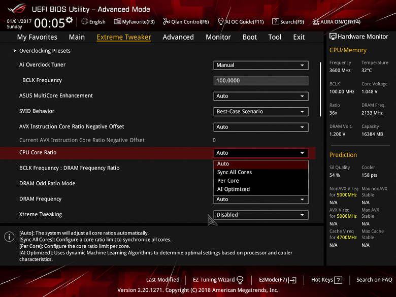 После этого появится возможность менять частоту BCLK и настраивать режим работы ядер процессора CPU Core Ratio. Причем кроме традиционных опций Auto, Sync All Cores и Per Core, появилась и новая опция AI Optimized.
