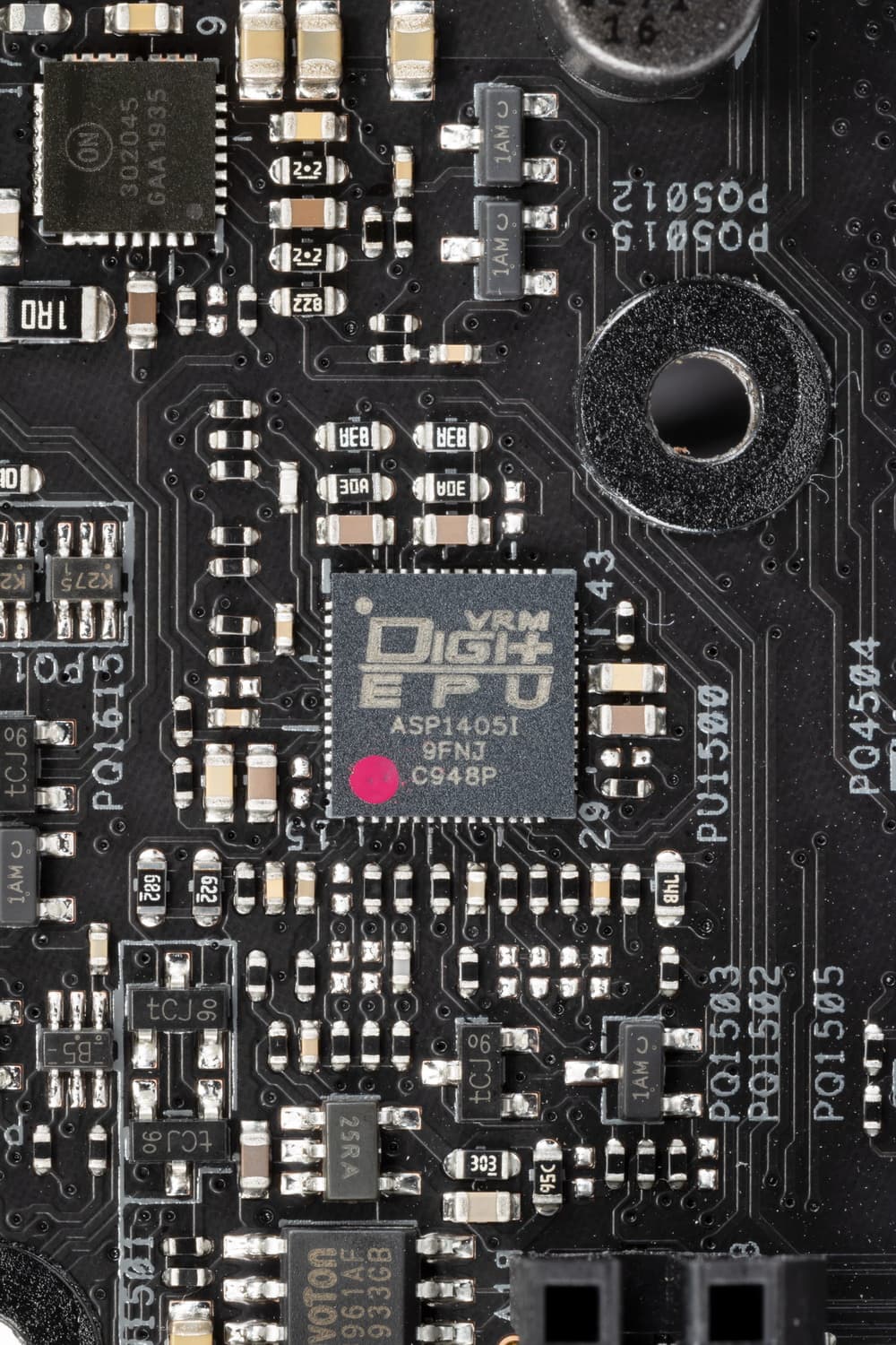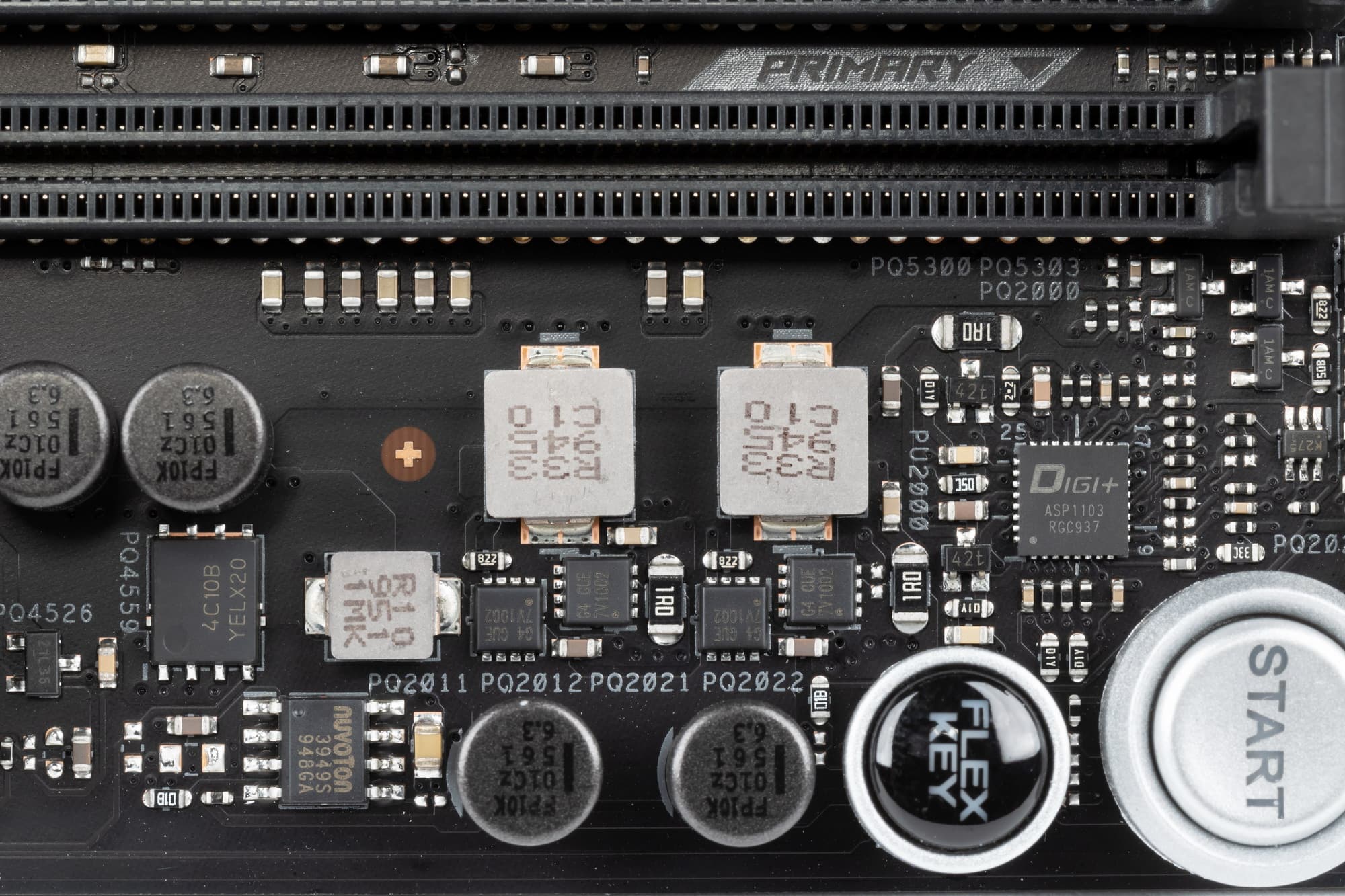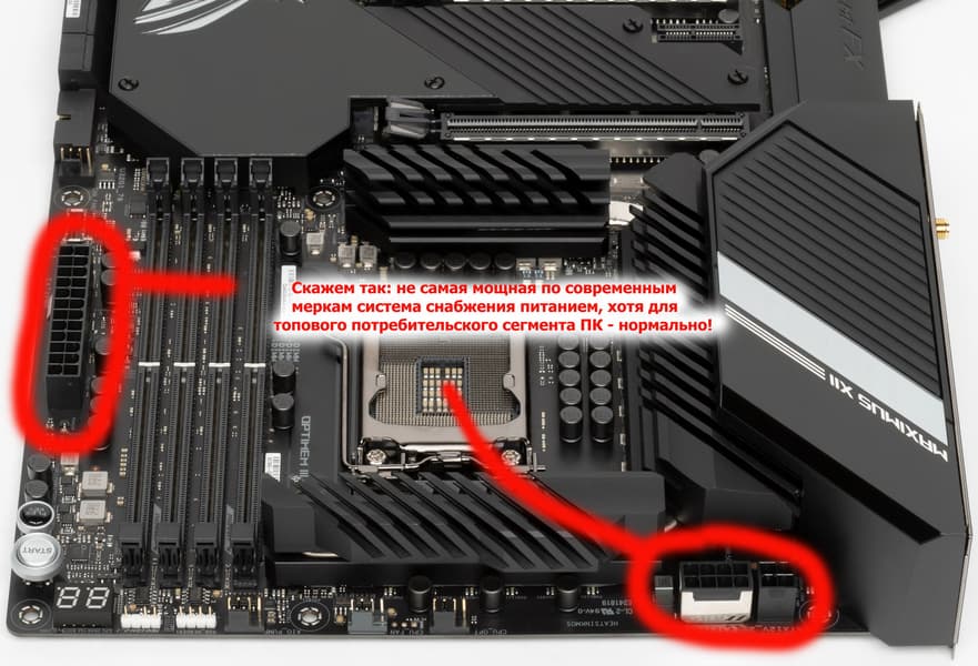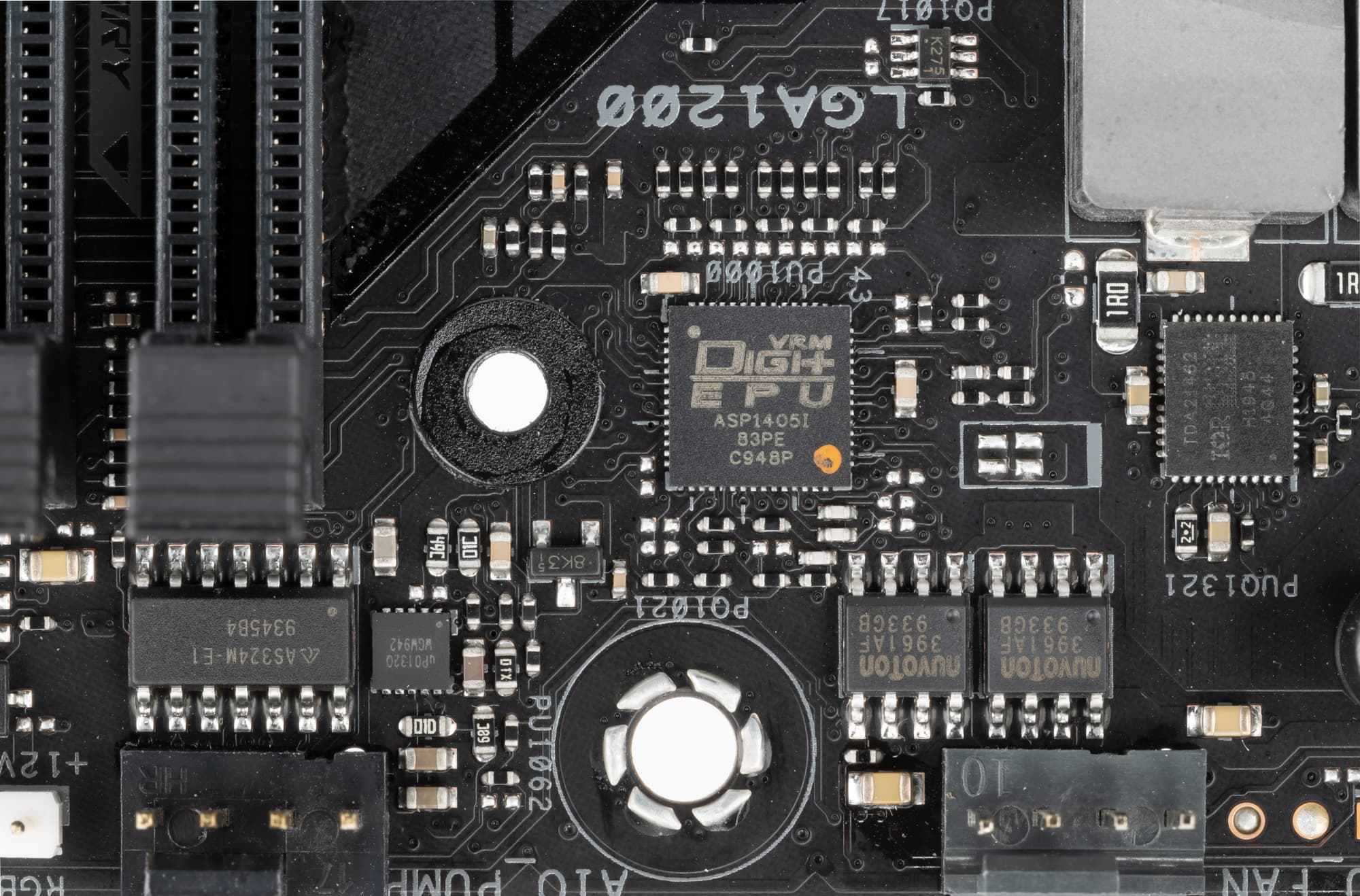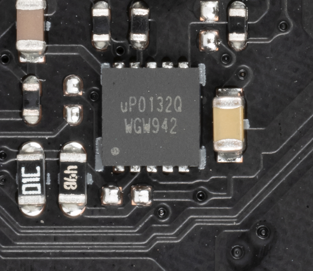 Конечно, мы привыкли, что самым честным является подход, когда ШИМ-контроллер дает прямые сигналы каждой сборке. Но при этом сделать разводку под честные фазы и поставить ШИМ-контроллер, умеющий работать с таким количеством фаз — много сложнее и дороже. Подход Asus/ROG тоже в принципе хорош (хоть и не является буквально честным). Все же удвоителей и тупо поделенных фаз нет. Есть контроллер TPU, который совместно с рядом иных распределяет фазы (ему помогают в этом «разбросанные» по плате переключатели от uPI Semiconduictor