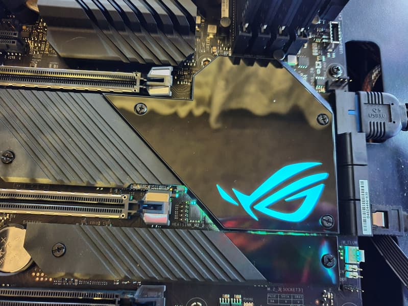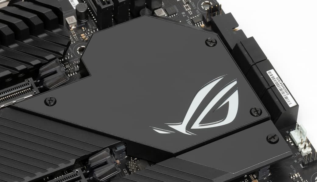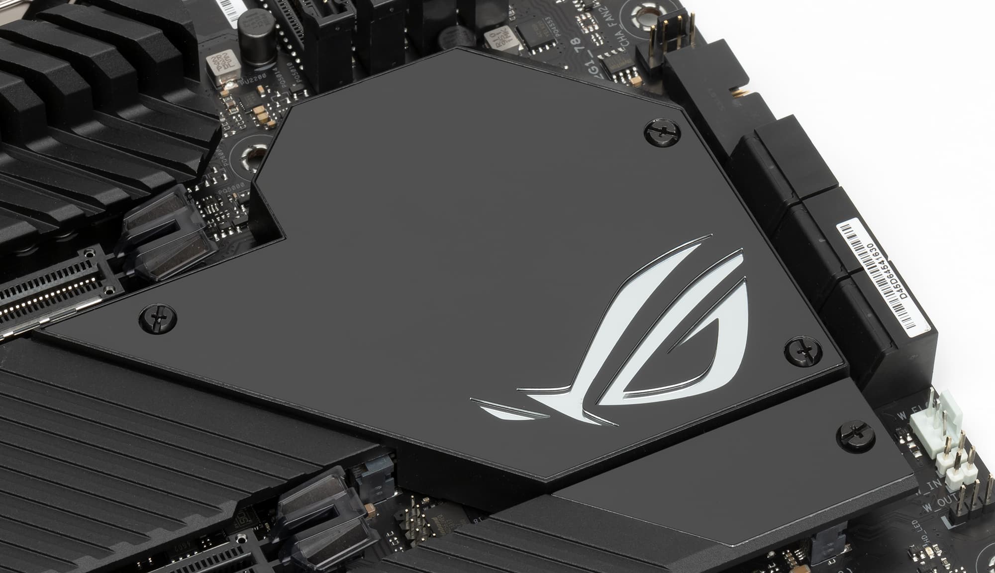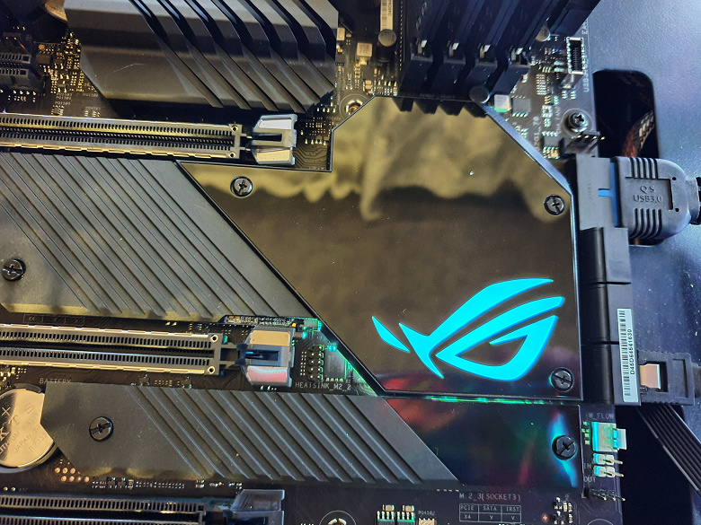 Как мы видим, охлаждение чипсета (один радиатор, прикрытый декоративной пластиковой крышкой с рассеивателем подсветки в виде лого ROG) организовано отдельно от силовых преобразователей.