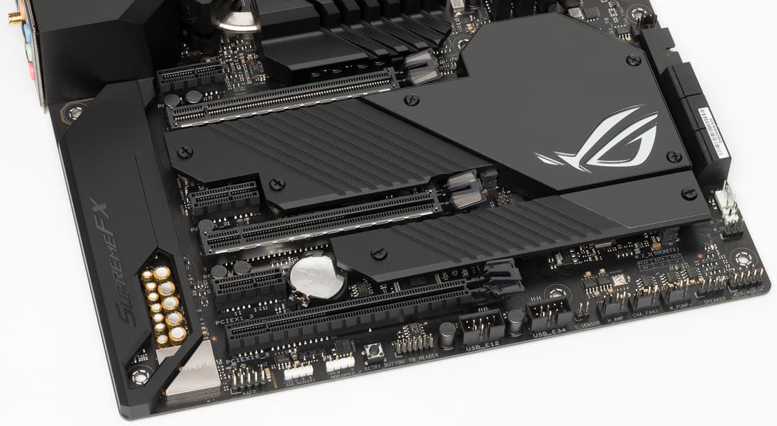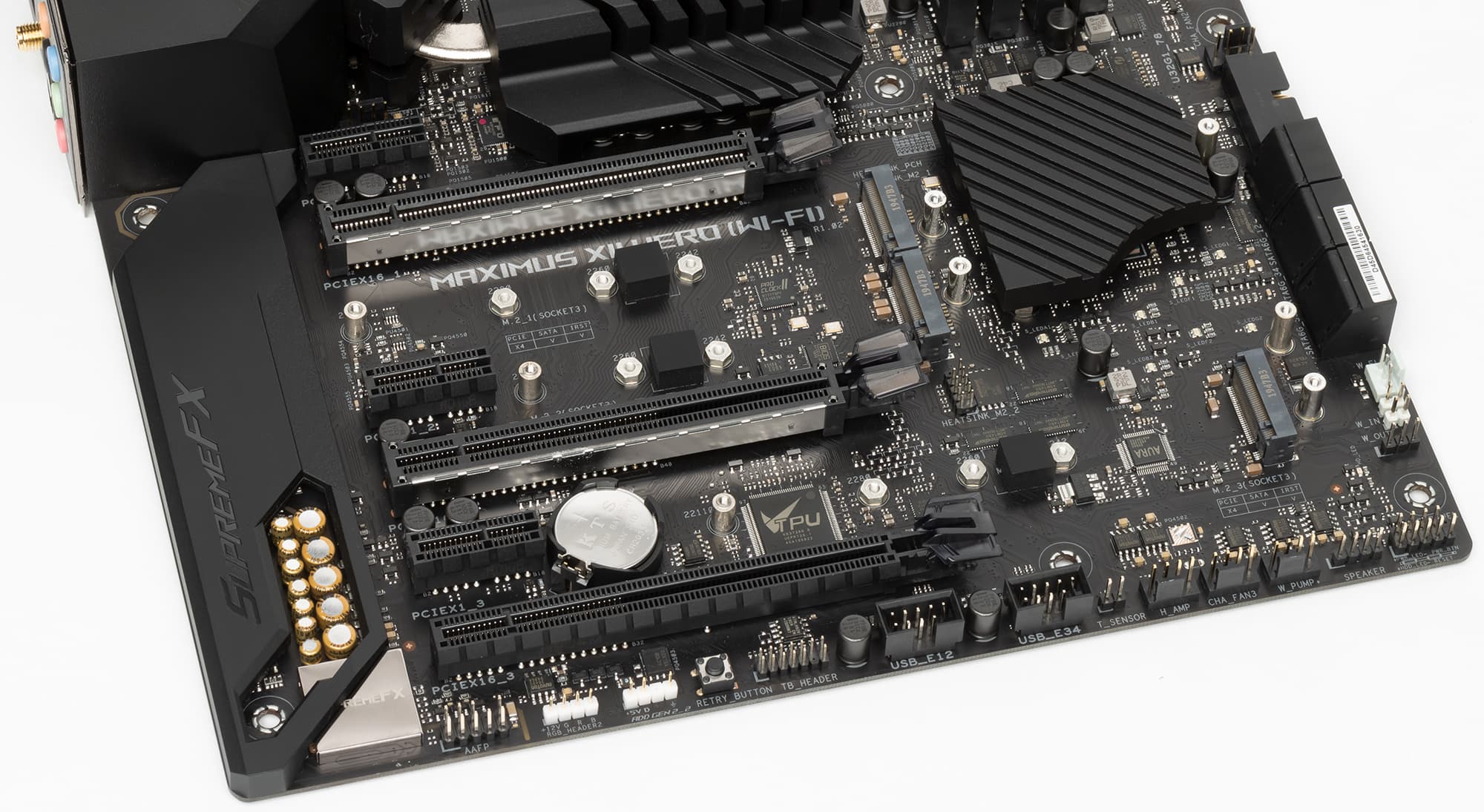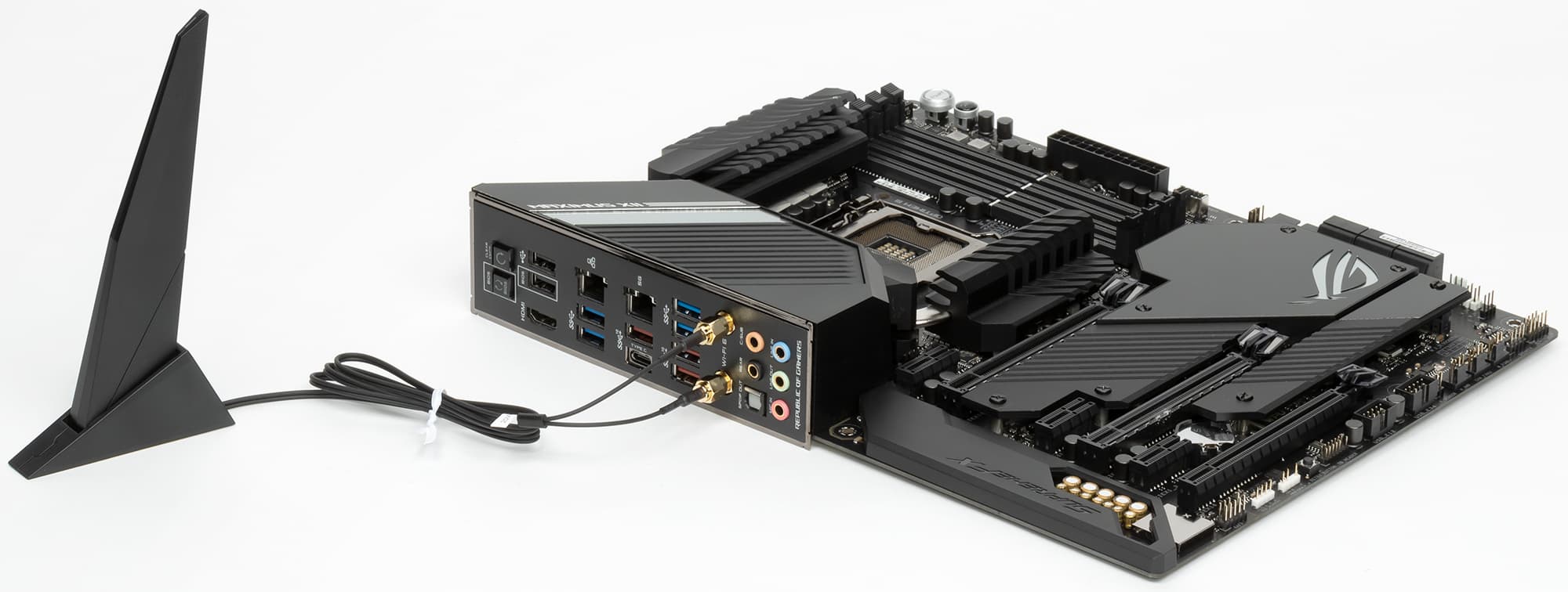 Функциональность у ROG Maximus XII Hero (Wi-Fi) весьма широкая: 17 портов USB разных видов (включая 5 самых быстрых на сегодня), 3 слота PCIe х16 (из которых первые два получают 16 линий PCIe от процессора с возможностью создать Nvidia SLI или AMD CrossFire, а третий работает только в режиме х4), 3 слота M.2, 6 портов SATA. Система питания процессора включает 16 фаз для ядра и способна обеспечить работу любых совместимых процессоров под серьезным разгоном. Плата имеет мощные радиаторы на силовых элементах системы питания, усиленные комплектным вентилятором, 8 разъемов для подключения вентиляторов и помп, также радиаторами оснащены все накопители в слотах M.2. Дополняют картину два проводных сетевых контроллера, включая один 5-гигабитный, а также беспроводной контроллер, реализующий Wi-Fi 802.11ac и Bluetooth 5.0.