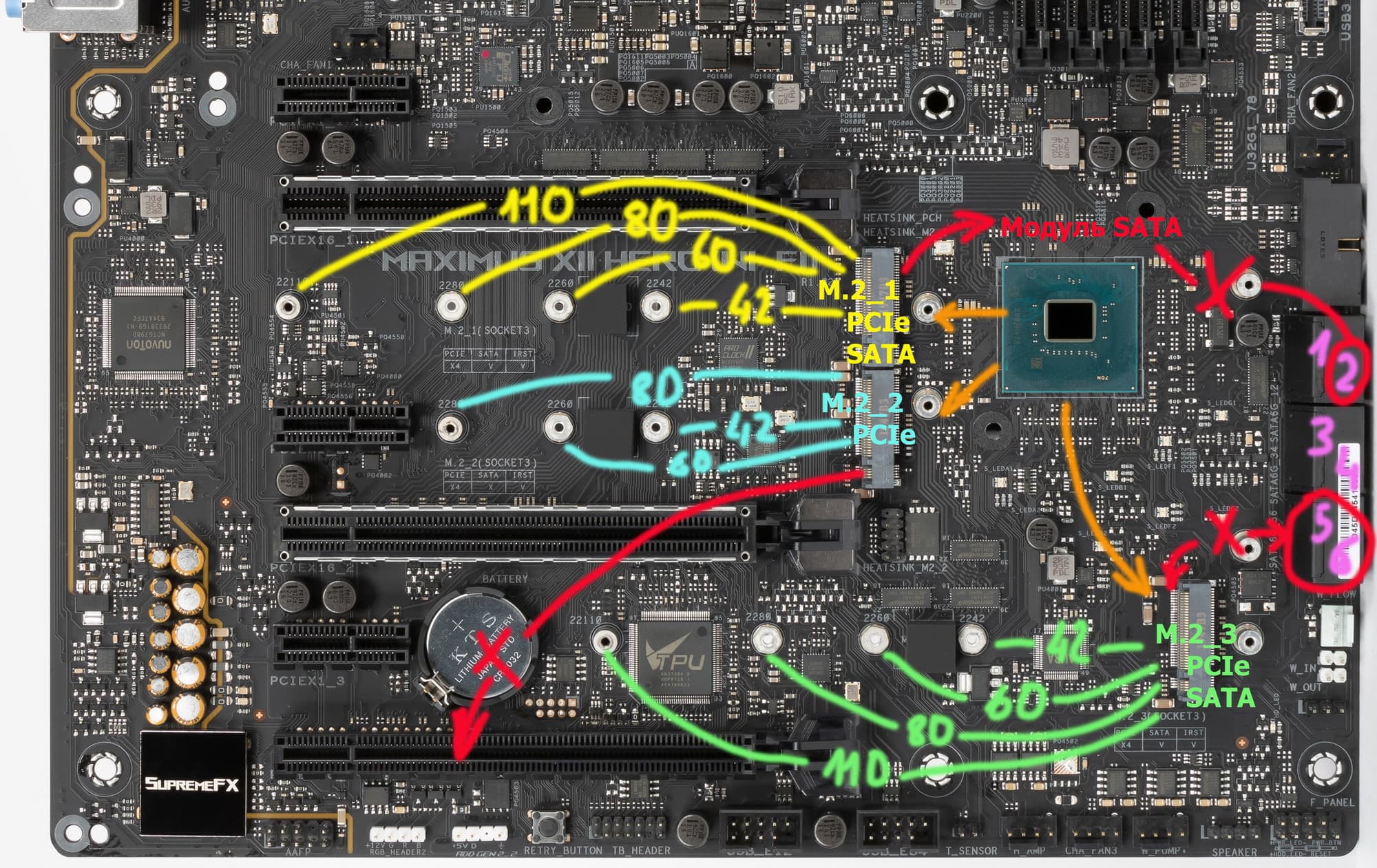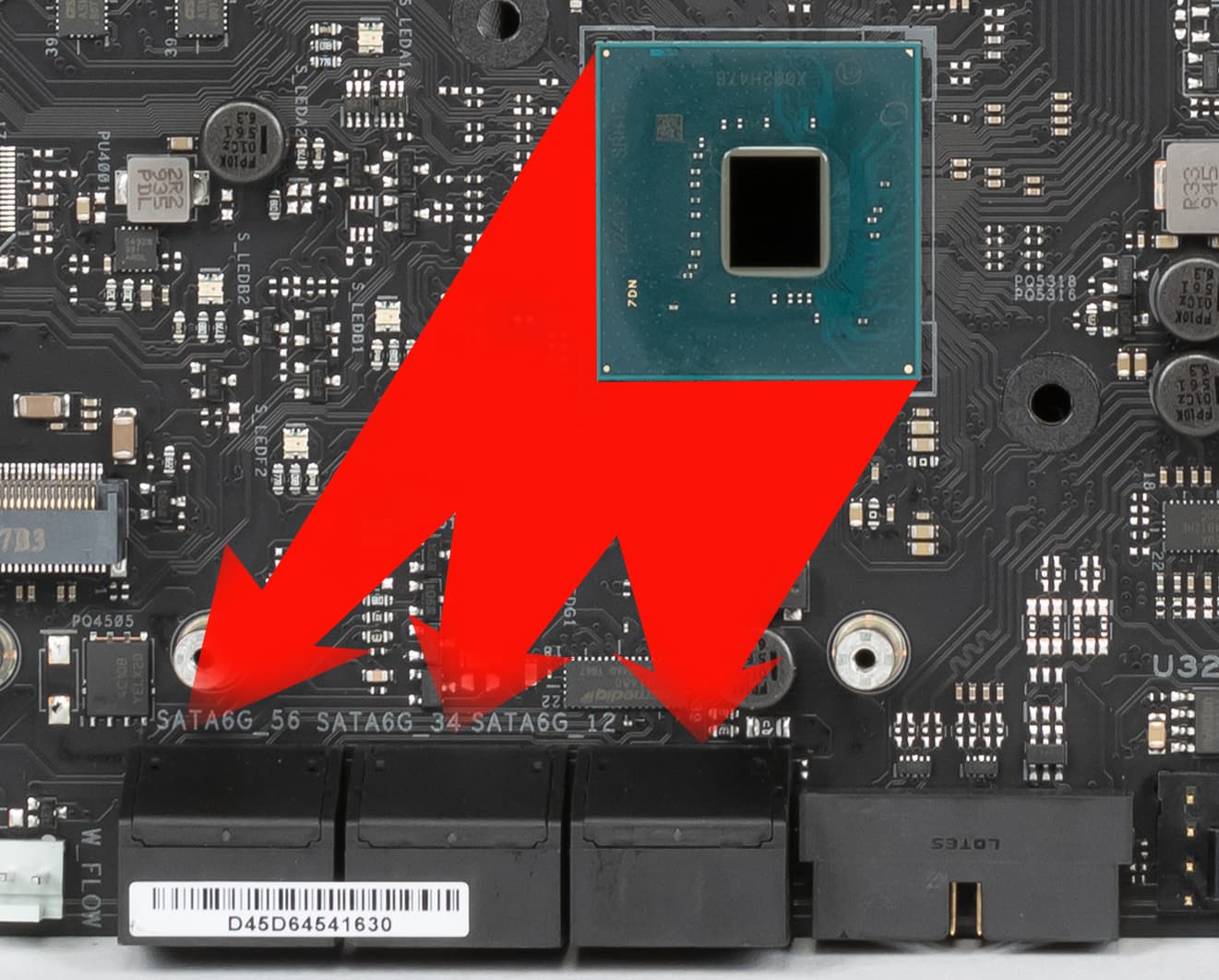 - Переключатель: или порты SATA_5/6 (2 линии), или слот M.2_3 (4 линии): максимум 4 линии;