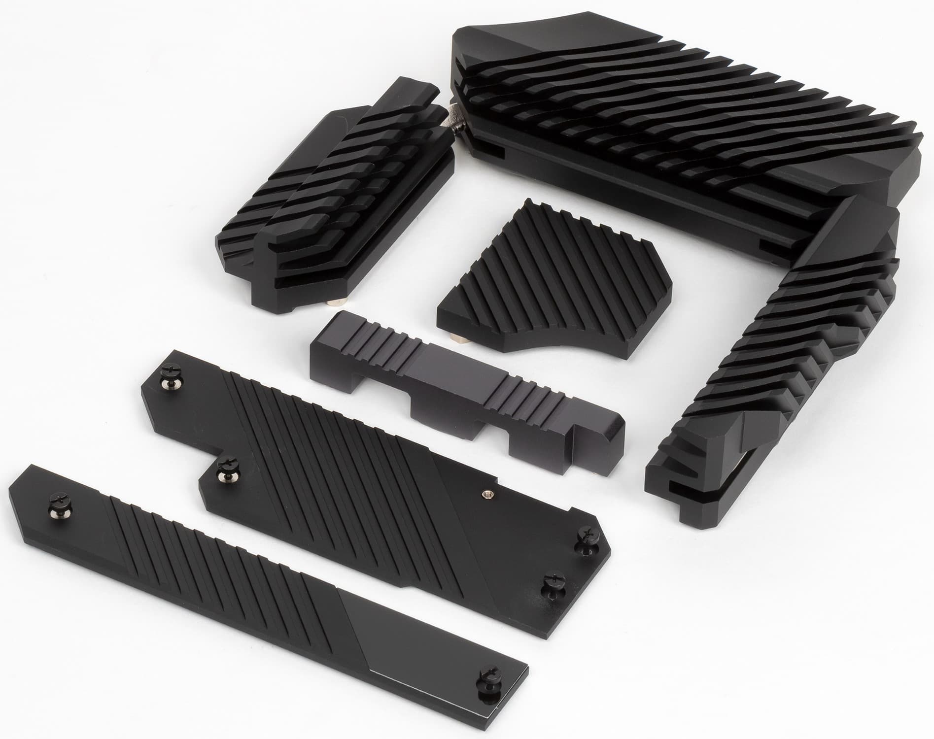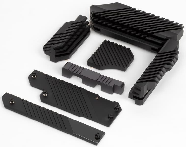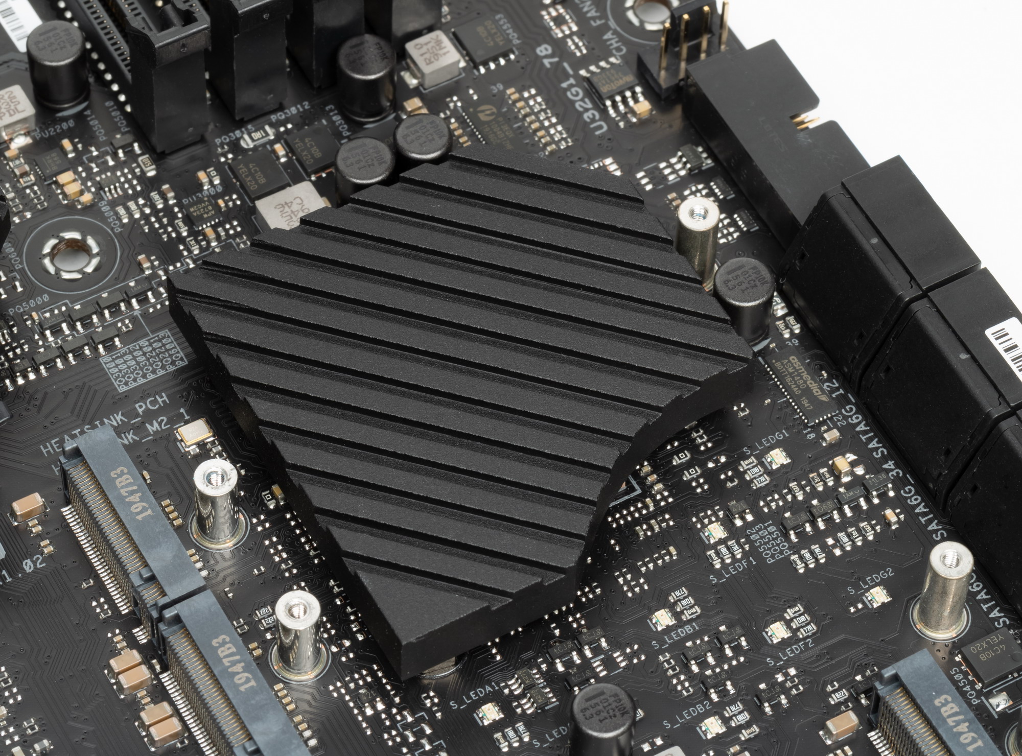 Все три M.2 слота имеют радиаторы, которые не связаны с какими-то иными устройствами охлаждения на данной плате. То, что справа прижимается к двум радиаторам, — это пластиковая крышка радиатора чипсета.