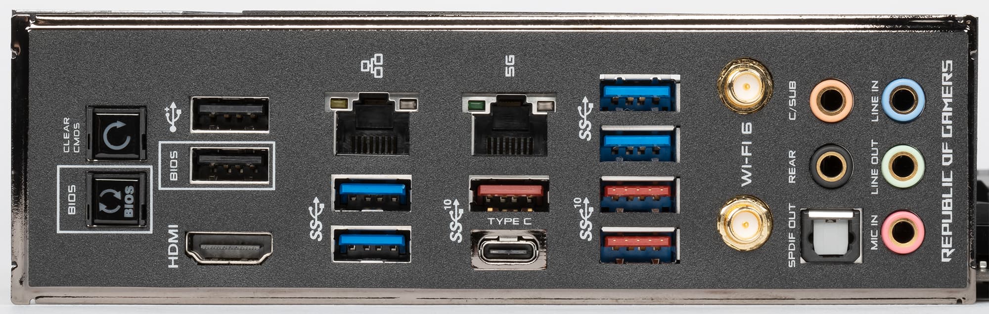 | Разъемы на задней панели | 1 × USB 3.2 Gen2 (Type-C) 3 × USB 3.2 Gen2 (Type-A) 4 × USB 3.2 Gen1 (Type-A) 2 × USB 2.0 (Type-A) 2 × RJ-45 5 аудиоразъемов типа миниджек 1 × S/PDIF (оптический, выход) 1 × HDMI 1.4 2 антенных разъема кнопка сброса CMOS кнопка перепрошивки BIOS — Flashback |